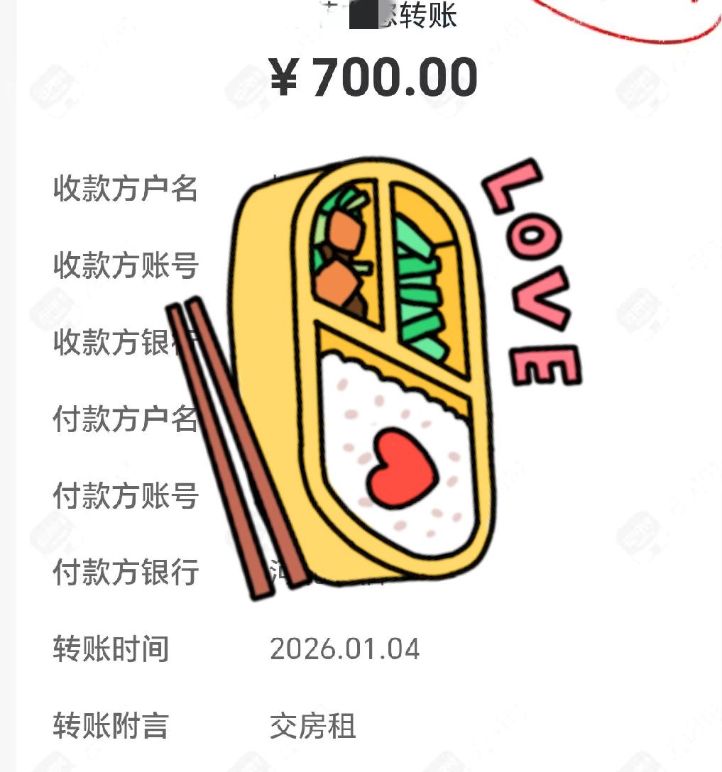 这套53平米的小房子, 每月租金700元, 原来是850一个月, 因为是租给同学, 她目前也不太富裕, 就收少一点, 我没收押金, 她说一月一付, 我说,ok,没问题, 她每月基本10号以前都会转给我, 钱虽然不多, 收到后心里踏实, 房子有点老, 不打算卖了, 租到没人租为止吧[灵光一闪]