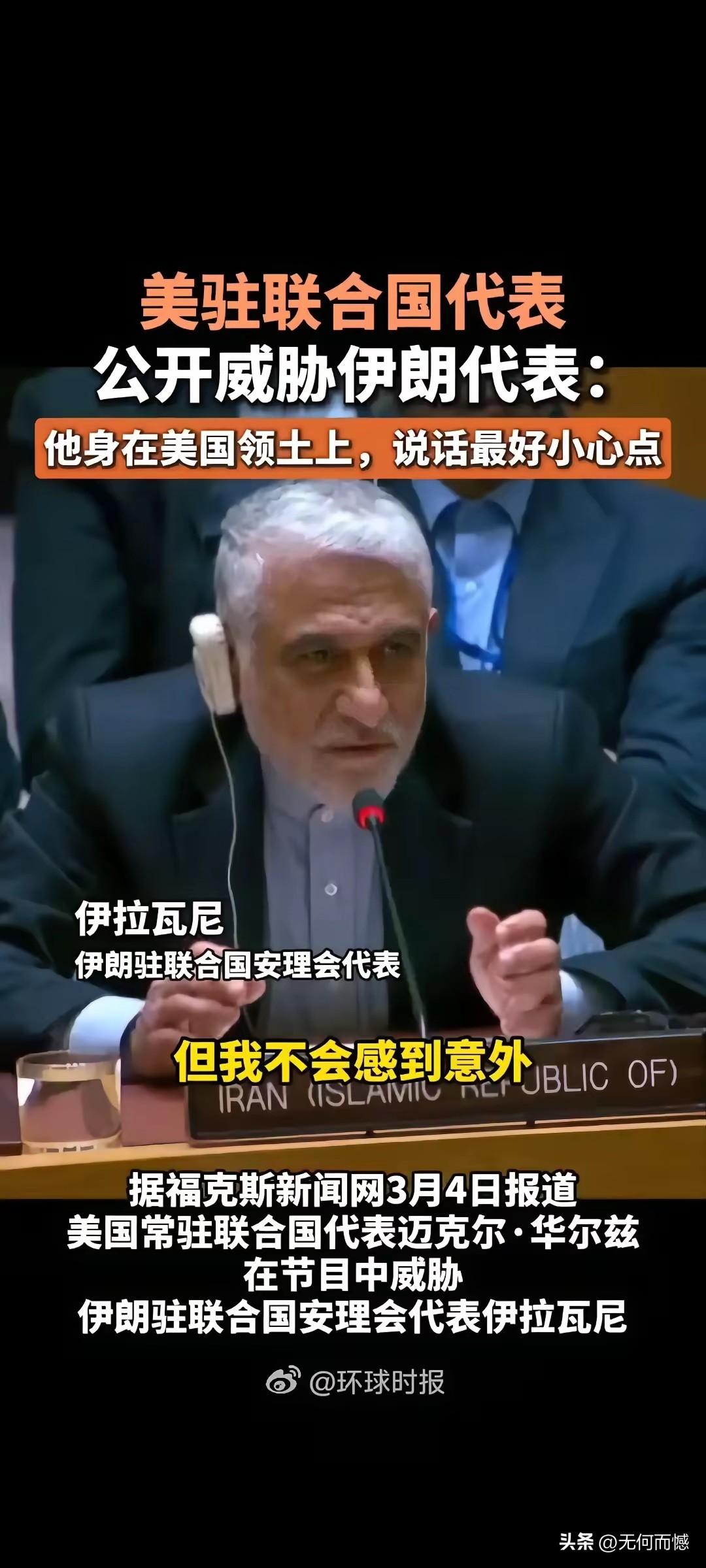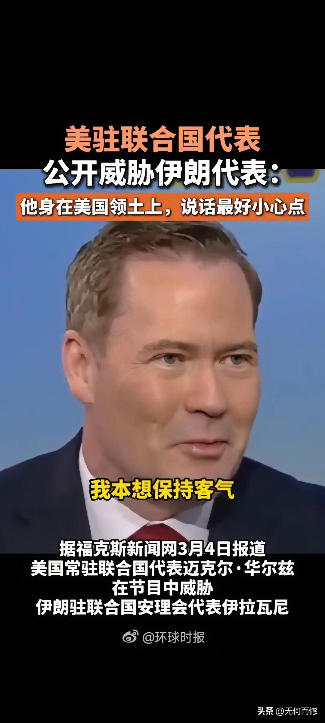 美国驻联合国的代表吃相太难看了,居然公开威胁伊朗代表,威胁伊朗代表说话要小心点,因为这是在美国的土地上,言外之意就是,虽然这是联合国会议,但毕竟是在我们家门口,如果你说话不小心的话,小心我收拾你,大概就是这个强盗逻辑,大概就是这个霸权思想!