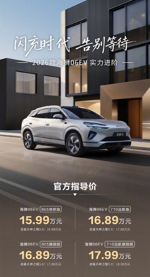 海狮06自由闪充告别等待闪充+第二代刀片电池,全车型铺开,这就是比亚迪今年的打法。在这一年疯狂的建站过程中,再通过一年免费权益来吸引大家。2026款比亚迪海狮06EV,售价15.99万元-17.99万元,把15万级价位的纯电 SUV,起步续航干到了605km。纯电车进入新阶段了~