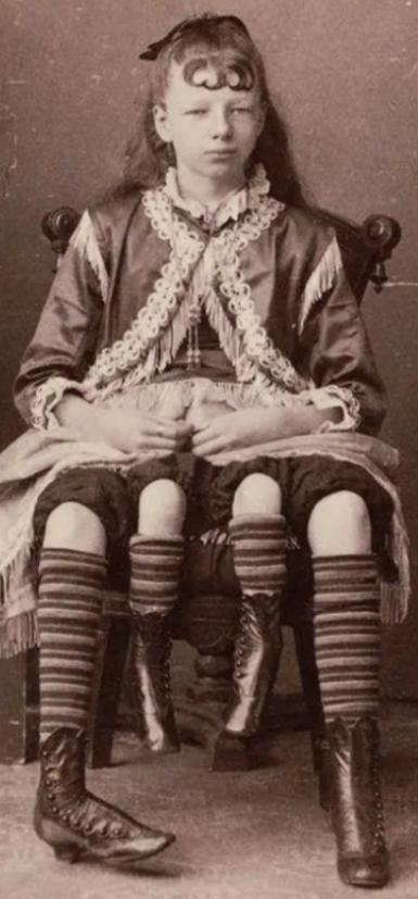 19世纪,美国一个天生四条腿和两个生殖器官的女孩,被父亲带去马戏团巡回展览,各大同行争相用假肢模仿,观众当场要求验证真假 1868年,美国的一个农家小院里,一声婴儿啼哭打破了午后的宁静,可这份喜悦没持续多久,就被接生婆的一声惊叫彻底击碎,这个女婴竟然长着四条腿。 默特尔的四条腿并非畸形那么简单,医学上称之为双臀畸形,说白了就是胚胎发育时,骨盆处分裂成了两份,那两条细小的内侧腿,本该属于一个没能完整发育的双胞胎姐妹,这种情况在当时极其罕见,别说普通农民家庭,就连专业医生都为之震惊,一度怀疑是她父母近亲结婚导致,最后证实只是一场意外。 在那个没有产前筛查、思想极度保守的年代,长相异常的孩子,无疑就是不祥之物,默特尔的父母是普通农民,看着襁褓中懵懂的女儿,既心疼又无奈,最终还是没狠下心抛弃她,可这份善意终究没能抵过生活的窘迫。 随着默特尔慢慢长大,四条腿带来的不便越来越明显,外侧两条腿正常能走路,内侧两条却无力承重,只能像累赘一样晃来晃去,母亲每天都要为她缝制特制的裤子,光是衣物和医药费,就压得这个家庭喘不过气。 更让人揪心的是,默特尔只要出门就会被路人围堵围观,有人指指点点,有人扔石子,还有人画着十字匆匆躲开,仿佛她是什么洪水猛兽。 为了活下去默特尔的父亲做了一个残酷的决定,在家门口挂起木牌,写上观看奇迹婴儿,一美分一次,就这样还没懂事的默特尔,成了父亲赚钱的工具,铜板落入铁罐的叮当声,成了她整个童年最刺耳的背景音,而这只是她被物化一生的开始。 当时的美国正盛行怪诞秀,马戏团大亨巴纳姆,就是靠搜罗奇人异事发家的,他听说了默特尔的存在后,立刻找上门,用一笔丰厚的预付款,买下了13岁的默特尔,给她取了个艺名四腿女孩,让她跟着马戏团巡回演出。 那时的默特尔每周能拿到最高250美元的报酬,这在当时普通工人一个月都赚不到,她的家人靠着这笔钱,从破木屋搬进了砖房,可默特尔却陷入了更深的深渊。 每晚默特尔都要穿着特制的华裙,站在刺眼的煤气灯下,被经纪人当作大自然的奇迹大肆宣扬,台下的观众掌声、口哨声不断,可没人真正把她当作一个人来看。 更荒唐的是因为默特尔太火爆,其他马戏团开始伪造四腿女,用假肢、藏人等手段蒙骗观众,久而久之观众开始怀疑默特尔的四条腿也是假的,经常有人在台下大喊脱下来看看,要求当场验证真假。 对于一个十几岁的姑娘来说,这种当众被羞辱、被质疑的场面,比被围观更让人崩溃,可她只能默默忍受,因为她知道自己一旦反抗,就会失去这份能让家人活下去的工作。 在那个年代,像默特尔这样的奇人,在马戏团里的地位和奴隶差不多,只是供人取乐的商品,可幸运的是,她在最黑暗的日子里,遇见了照亮她一生的人,随行医生詹姆斯·比克内尔。 和其他猎奇的人不一样,比克内尔第一次给默特尔检查身体时,没有盯着她的四条腿看,而是温柔地问她这里会疼吗,他看她的眼神,充满了尊重,没有怜悯更没有猎奇,后来比克内尔经常来看默特尔,带她读诗集,陪她说话,告诉她你是我见过最坚强的女性。 当比克内尔向默特尔求婚时,她第一反应就是拒绝,她低着头看着自己的四条腿,自卑地说我甚至不能算完整的女人,可比克内尔单膝跪地,小心翼翼地避开她的额外肢体,紧紧握住她的手说:我爱的是你,和你有几条腿没有任何关系。 19岁那年默特尔脱下了舞台的华服,穿上了婚纱,嫁给了比克内尔,过上了她从未奢望过的平静生活,更让人意外的是,曾经被医学界断言无法生育的她,竟然陆续生下了五个健康的孩子,孩子们依偎在她怀里,从来不会在意她那两条多余的腿,只知道这是爱他们的母亲。 可安稳的日子没过多久,随着孩子们长大,家庭开支越来越大,再加上投资失误,家里经济陷入困境,41岁的默特尔不得不再次重返舞台,这一次她不再是为了家人的贪婪,而是为了守护自己的小家,此时的她眼神里多了沧桑与平静,不再在意观众的指指点点,只想着赚够钱,早日回归家庭。 1915年47岁的默特尔永久告别了舞台,晚年的她身体越来越差,四条腿带来的并发症不断困扰着她。 1928年,一场普通的腿部感染,因为当时医疗条件有限,没能得到有效治疗,最终引发全身炎症,默特尔在家人的陪伴下,安详离世,还差六天就满60岁。 让人泪目的是默特尔死后,比克内尔为了守护她最后的尊严,特意让人在她的棺木上浇筑了厚厚的混凝土,因为他知道还有很多博物馆和收藏家,觊觎着默特尔奇特的遗体,想要把她当作展品,继续供人围观,这层冰冷的混凝土,成了比克内尔给她最后的爱,守护她在另一个世界不再被打扰。 麻烦各位读者点一下右上角的“关注”,留下您的精彩评论与大家一同探讨,感谢您的强烈支持!