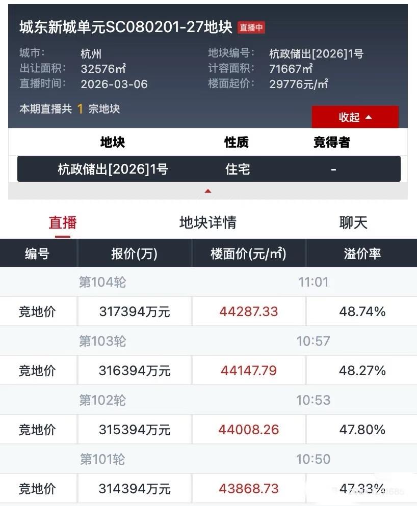 杭州马年第一拍:保利51%高溢价拿地! 杭州土拍市场开年就杀疯了! 城东新城一块地经过109轮竞价,被保利以楼面价44985元/㎡拿下,溢价率高达51%!这意味着未来房价要卖到8万+才能保本! 这块地起拍价才2.9万/㎡,就因为周边有翠隐江粼(地价4万/㎡)和华润地块(地价5万/㎡)对标,直接引发疯抢!更扎心的是,这块地还是双水系环绕,离地铁4号线只有200米,对面就是采荷中学,属于闭眼买都不会错的“神仙地块”。