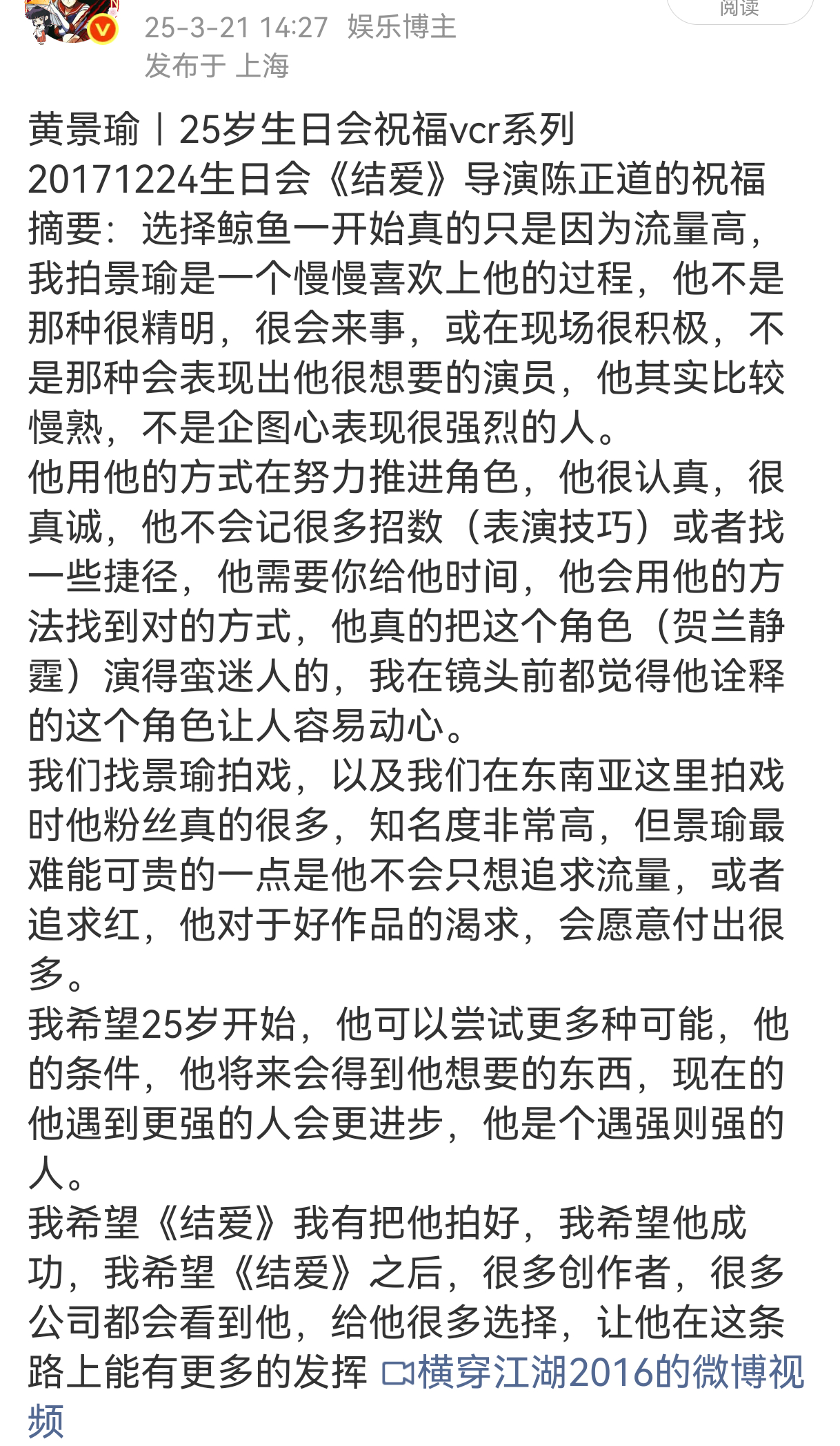 黄景瑜的时光机:用自己的用心演绎和完美诠释换来的真心祝愿20171224黄景瑜25岁生日会《结爱》导演寄语:我拍景瑜是一个慢慢喜欢上他的过程,他对于好作品的渴求,会愿意付出很多。他将来会得到他想要的东西,现在的他遇到更强的人会更进步,他是个遇强则强的人。我希望他成功,我希望《结爱》之后,很多创作者,很多公司都会看到他,给他很多选择,让他在这条路上能有更多的发挥20260306《岁月有情时》收官收官制片人寄语:黄景瑜看似憨憨大直男其实在人物细节里加入了非常多的揣摩,感谢黄景瑜看见万家烟火,懂得调节人间温度,黄景瑜值得更好的未来!