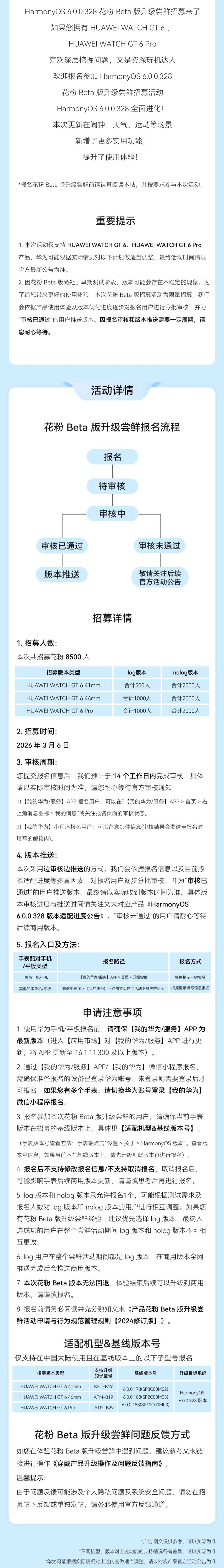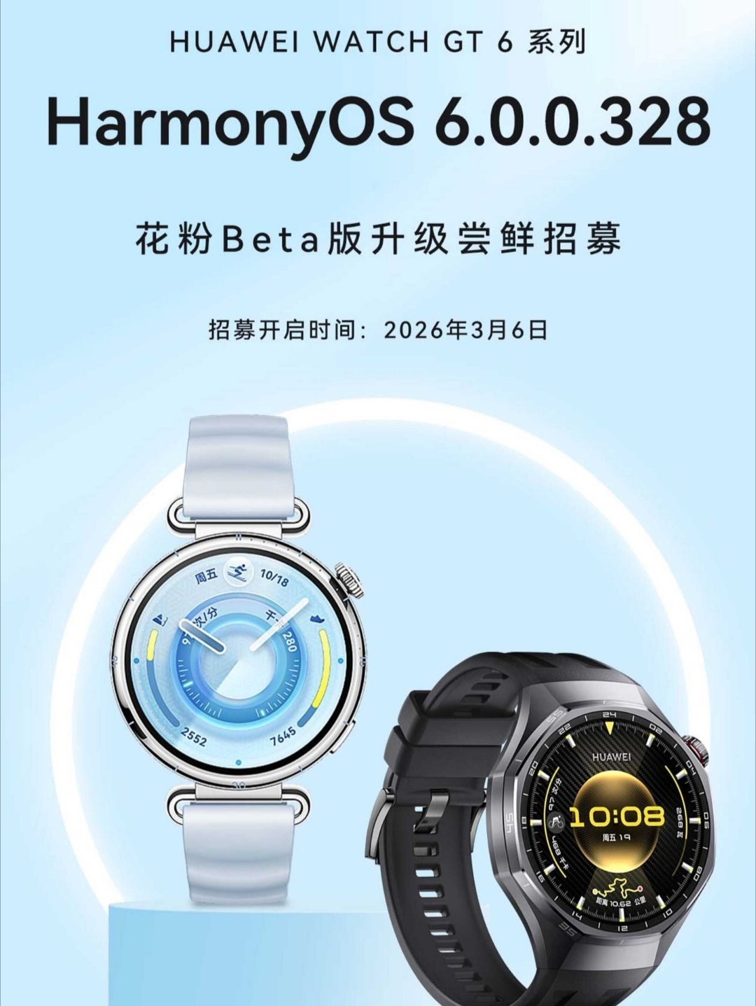 华为官方团队 HarmonyOS 课代表宣布,HUAWEI WATCH GT 6 系列开启 HarmonyOS 6 花粉 Beta 版升级尝鲜招募。