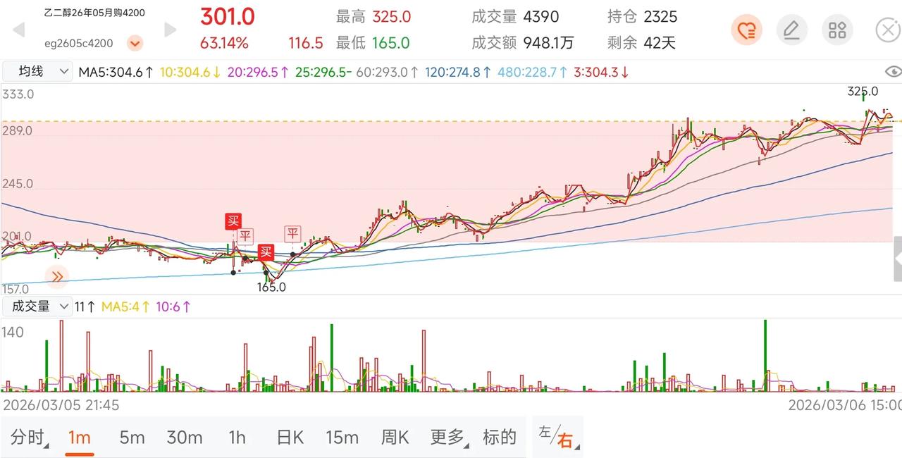 设个条件单,错过了翻倍行情。拉长时间看,20左右买的,几天不到就翻倍了,但那些做反的,也腰斩再腰斩了。上游原油、甲醇、煤,下游80%以上是聚酯,多用于纺织服装,饮料包装。往年金三银四,今年预期不好,纯原料涨价,长期低于生产成本爆发了,放30min看就是上升的回调,这就是所谓的看大做小,,要顺趋势做,早上买后下跌,懒得盯盘,怕继续跌,直接挂了均价,当时条件单想的就是均线附近会有支撑,小博弈一把。这就和烧碱差不多,不过烧碱亏损,副产品氯赚钱,下游铝是数据中心需求金属,铝赚钱了,上游不能亏着吧?聚酯工业