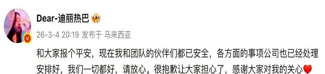 迪丽热巴在迪拜机场熬了72小时,头顶飞的不是客机是导弹。 你以为顶流出国都是私人飞机香槟伺候?她为了赶巴黎大秀,老老实实买机票去中东转机。谁知炮声一响,多国关闭领空,航司直接停飞所有航班。 网上那些敲键盘说她去见土豪捞快钱的可以闭嘴了。真实情况是造型师团队直飞巴黎早早落地,偏偏她撞上地缘冲突,在候机楼里硬生生把看秀行程拖成荒野求生。现在她终于撤退到安全区发文报了平安。 聚光灯下没有刀枪不入的神明,战火面前也没有特事特办的明星。这不是一出豪门夜宴的八卦连载,而是一场真枪实弹的生存盲盒。