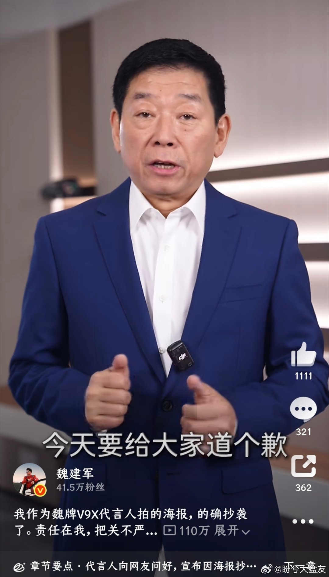 魏建军就海报抄袭道歉感觉魏总挺实在的,相信他不是故意的!
