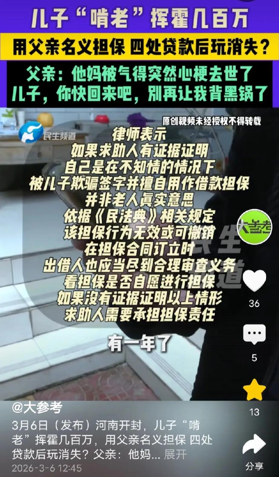 太坑爹了!河南开封,男子拿着合同骗不识字的父亲说,要把门面房租出去,让父亲签字,老父亲信以为真,签下自己名字,直到大批债主上门,他才崩溃发现:自己签的根本不是租房合同,而是儿子的贷款担保!如今儿子早已消失,所有外债全压在年迈父亲身上。父亲对着媒体痛哭:他把我老伴气死了,现在又让我背一辈子债。 王大爷找到媒体,痛哭流涕,他说他的儿子把他害惨了。 王大爷有三个孩子,两个女儿一个儿子,原本他和老伴很疼爱这个儿子,事事为他着想,可儿子的做法伤透了他们的心。 王大爷的儿子王先生已经三十多岁了,可他做事却没有一个三十多岁男人该有的担当。 2017年的时候,王先生突然迷上网络赌 博,每天沉迷在网络游戏里,每次往里充钱都是几千几千地充。 当年王先生的母亲做生意,手里有一定的积蓄,起初王先生为了玩游戏跟母亲借了200万,但是这200万没挺多久就全花光了。 有一次,王先生谎称借用妻子的手机打电话,拿到手机后,竟偷偷用妻子的信息办理了56000元的贷款。 接连的欺骗与负债,让家里的积蓄被掏空,他还依旧四处借钱、挥霍无度。妻子彻底心灰意冷,最终带着女儿离开了他。 王大爷和老伴为了替王先生还债,积蓄都花光了,还到处借钱,亲朋好友都借了个遍,还没法填补他欠下的窟窿。 2023年的一天,债主再次上门催债,王大爷的老伴无力偿还,又被催逼得紧,急火攻心,突发心梗不幸去世。 王先生听说母亲过世后,回到家跪在母亲的灵柩前,痛哭流涕,他跟父亲承诺从此痛改前非,好好做人。 王大爷想着儿子知错能改,原谅了他,也决定给他一个机会。 不久后,王大爷把家里的10万元现金、110万的门面房房本和三四百万的欠条交给王先生,说以后这个家就靠他了。 王大爷以为,儿子会拿着这些本钱好好做生意,东山再起。 谁料,儿子把钱拿到手后,声称出去讨债再次消失。 一段时间后,王先生突然回到家,拿了一份合同对王大爷说,他要把门面房租出去,让王大爷签字。 大字不识一个的王大爷信以为真,很爽快地在合同上歪歪扭扭地写下了自己的名字。 可王大爷不知道的是那根本不是什么租房合同,而是房子抵押合同。 直到大批债主上门讨债,王大爷才知道,他被儿子骗了。 可他再联系儿子,却怎么也联系不上,一年多过去了,王先生始终不肯露面。 王大爷每天被不同的债主上门讨债,心烦意乱,无奈的他找到媒体求助。 王大爷的前儿媳也替王大爷着急,她告诉记者,她从王先生朋友那得知,王先生拿着房本以他父亲的名义到小额贷款公司到处行骗到处借款,据她所知道的就有160万。 记者试图联系王先生,但是他的电话已经停机。 王大爷很着急也很无奈,他除了觉得委屈,更多的是担心儿子的安危,他对着镜头对儿子喊话:儿子你快回来吧,别再让我替你背黑锅了。 不得不说,这个王先生真是太让人寒心了!一点良心都没有,活活把母亲给气死了,转头又回来算计自己亲爹。 不识字的老父亲一心相信儿子,就因为他一句“租房签字”,稀里糊涂背上了巨额担保债。儿子拿了房本、骗了签字,自己拍屁股消失,留下一屁股烂债全压在年迈老爹身上,天天被债主上门逼债,哭天喊地都没用。 养儿一场,掏心掏肺给钱给房,最后落得家破人亡、负债累累,真是叫人又心疼又气愤! 《民法典》第148条规定,一方以欺诈手段,使对方在违背真实意思的情况下实施的民事法律行为,受欺诈方有权请求法院或仲裁机构予以撤销。 王先生谎称是租房合同,利用王大爷不识字隐瞒真实内容,让王大爷在被骗情况下签了担保抵押合同,完全是违背老人真实意思,王大爷可以用这条法律请求法院撤销这份合同,撤销后合同就无效,不用承担担保责任。 《民法典》第143条规定,具备行为人具有相应民事行为能力、意思表示真实、不违反法律强制性规定和公序良俗这三个条件,民事法律行为才有效。 王大爷不识字,被儿子欺骗签字,根本不是自愿要做担保抵押,意思表示不真实,不符合有效条件,这份担保抵押合同依法应认定无效,王大爷不需要替儿子还债。