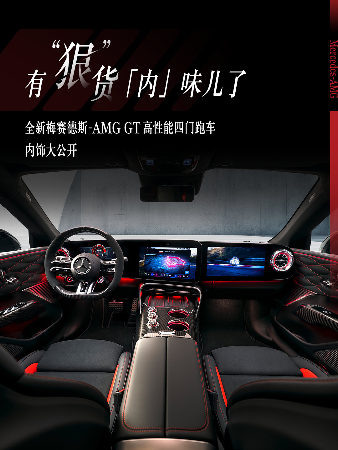 AMG最新GT四门车内饰发布时尚的部分由大屏幕和氛围灯负责,性能的部分由材质和配色负责,复古的部分由圆形物理按钮负责,帅呆了大v聊车amg gtamggt高性能四门跑车 北京·北京诺金酒店