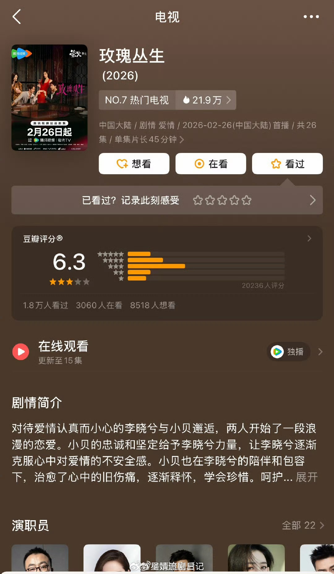 玫瑰丛生豆瓣仅有2万余人打出6.3分,这部剧从开播以来一直没什么讨论度和存在感。这部剧的播出成绩让粉丝为刘宇宁贴上的扛剧生标签掉了。感觉他真的没什么剧粉,全是歌手粉和综艺粉。