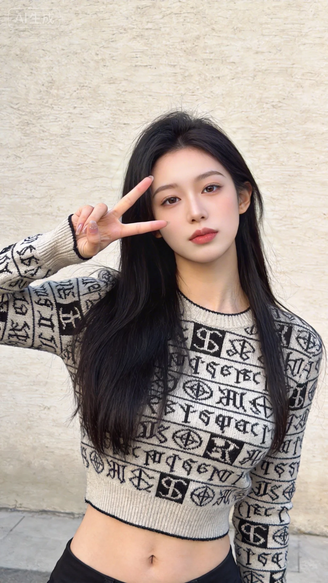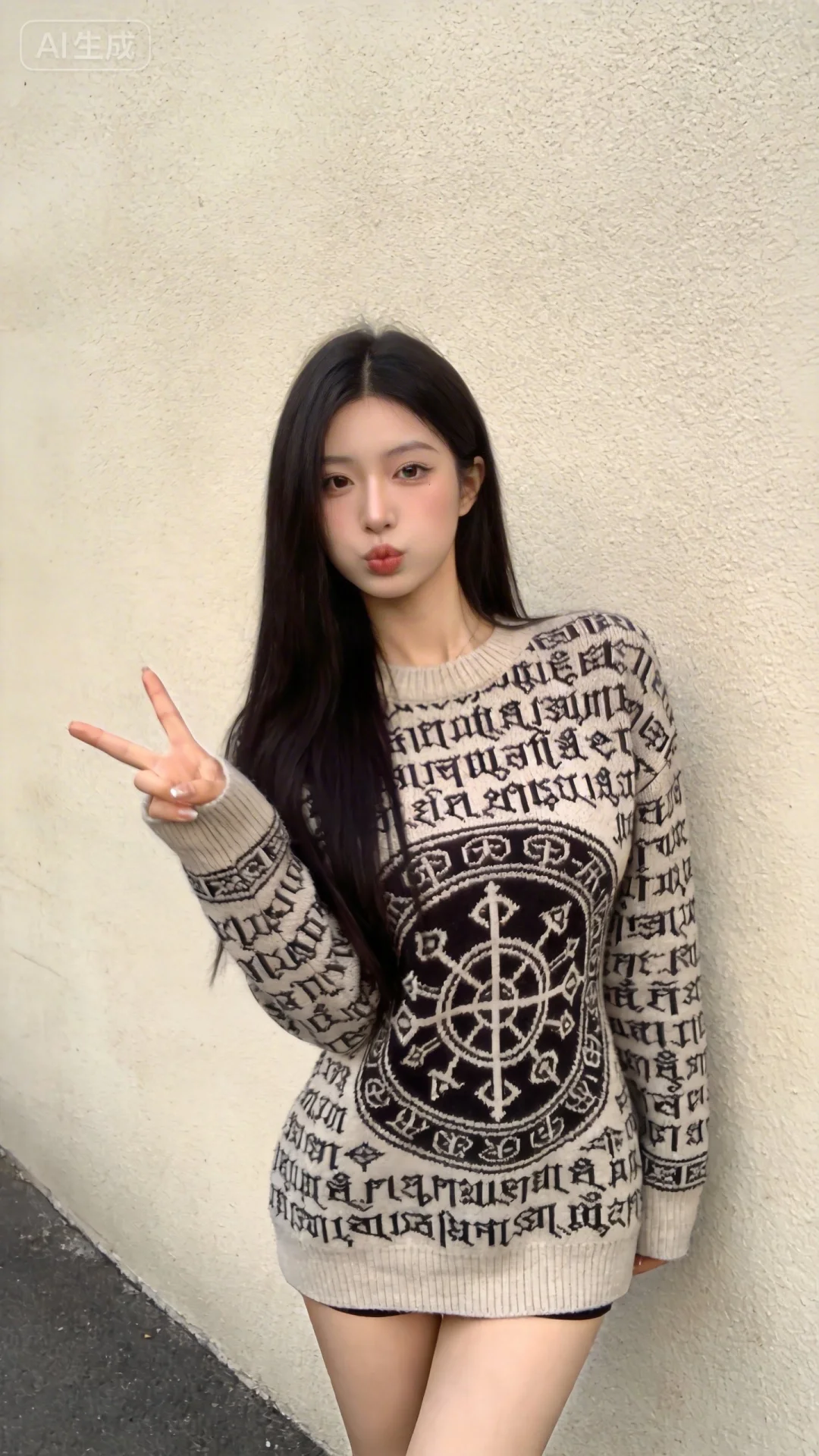 一位长发及腰模样可爱的女生,构图随意却尽显生活中的绚丽日常,人像摄影,日常快照风格,非精心构图或打光,妖冶少女网红脸,高颜值,冷白皮,时尚穿搭,瓜子脸尖下巴,皮肤白皙,底妆通透,肤色均匀自然,纯欲风,明星气质,沙漏形身材,S曲线,鹅蛋脸。光线柔和自然,非均匀打光,表情自然松弛,照片毫无修饰感,带有生活真实感。ccd拍照感,真人真实,黄金比例大师摄影手,原片直出、不加修饰、本色出镜、真实细节、原生细节、随手抓拍、自然状态,妆容精致,呈现出时尚且有氛围感的明星形象,户外场景,繁琐符文图案毛衣,漂亮女生,19岁网红女,冷白皮,可爱动作表情(背景是一面浅米色的质感墙面,简洁干净,没有多余的装饰,一只手比耶