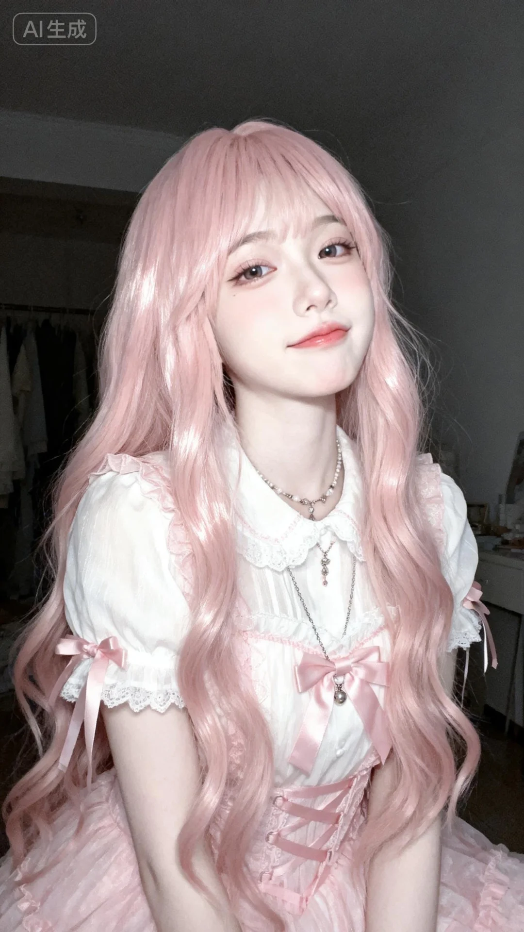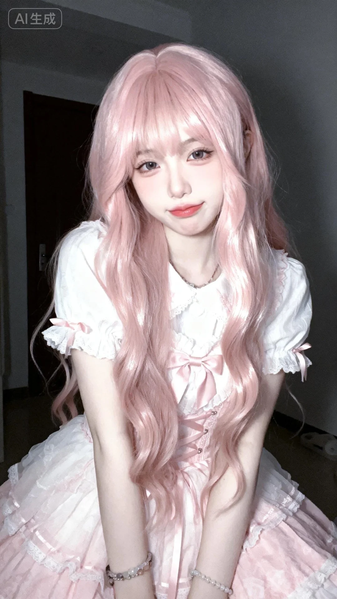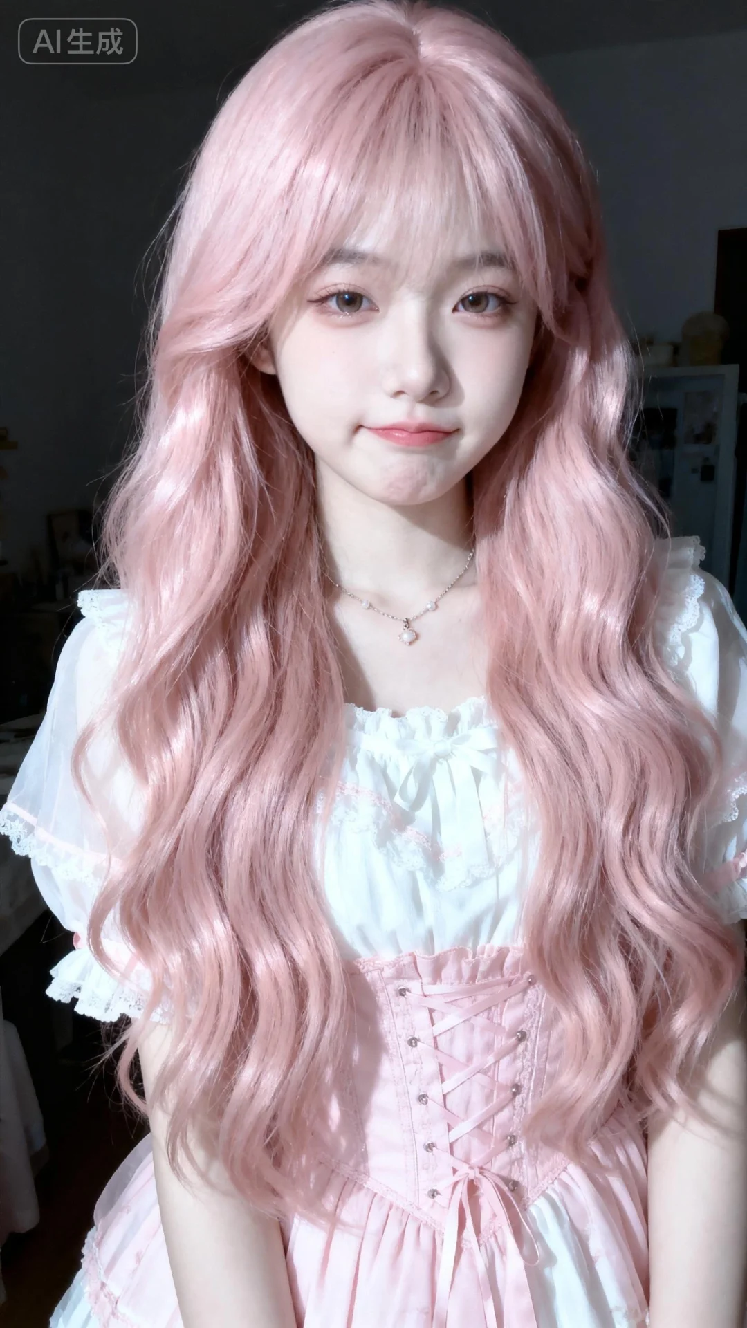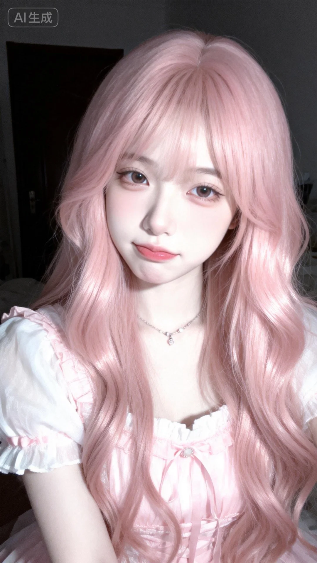 以墨明风格艺术美学呈现画面。画面中的离尘师妹模样极为可爱,有着幼态脸蛋,有着可爱无辜且眼睑下至的眼睛。她拥有浅粉色森系长卷发型,发丝垂坠且轻抚泛光,瓷感白肌肤,身着粉白色薄款洛丽塔服装,清纯动人,佩戴简约饰品,露出撇嘴的可爱俏皮娇俏微表情,楚楚可怜。画面聚焦面部,高曝低饱和,整体处于暗调静谧房间的慵懒氛围中,构图平庸,呈现生活快照般的随手一拍抓拍风格,半身照