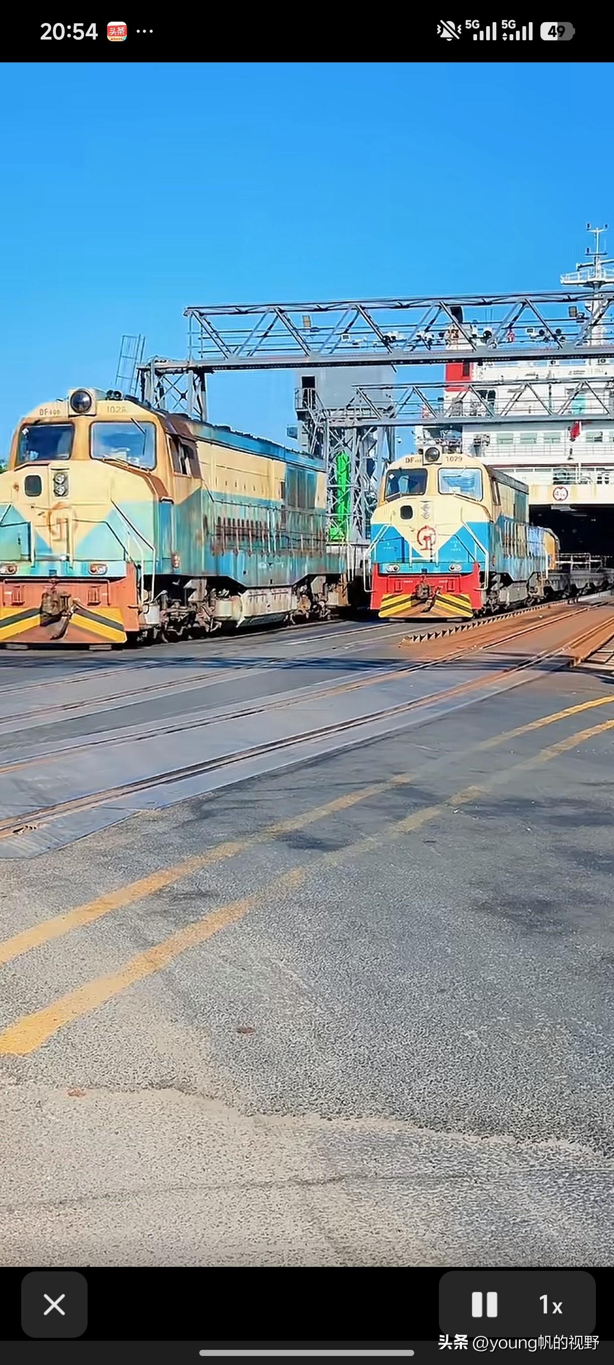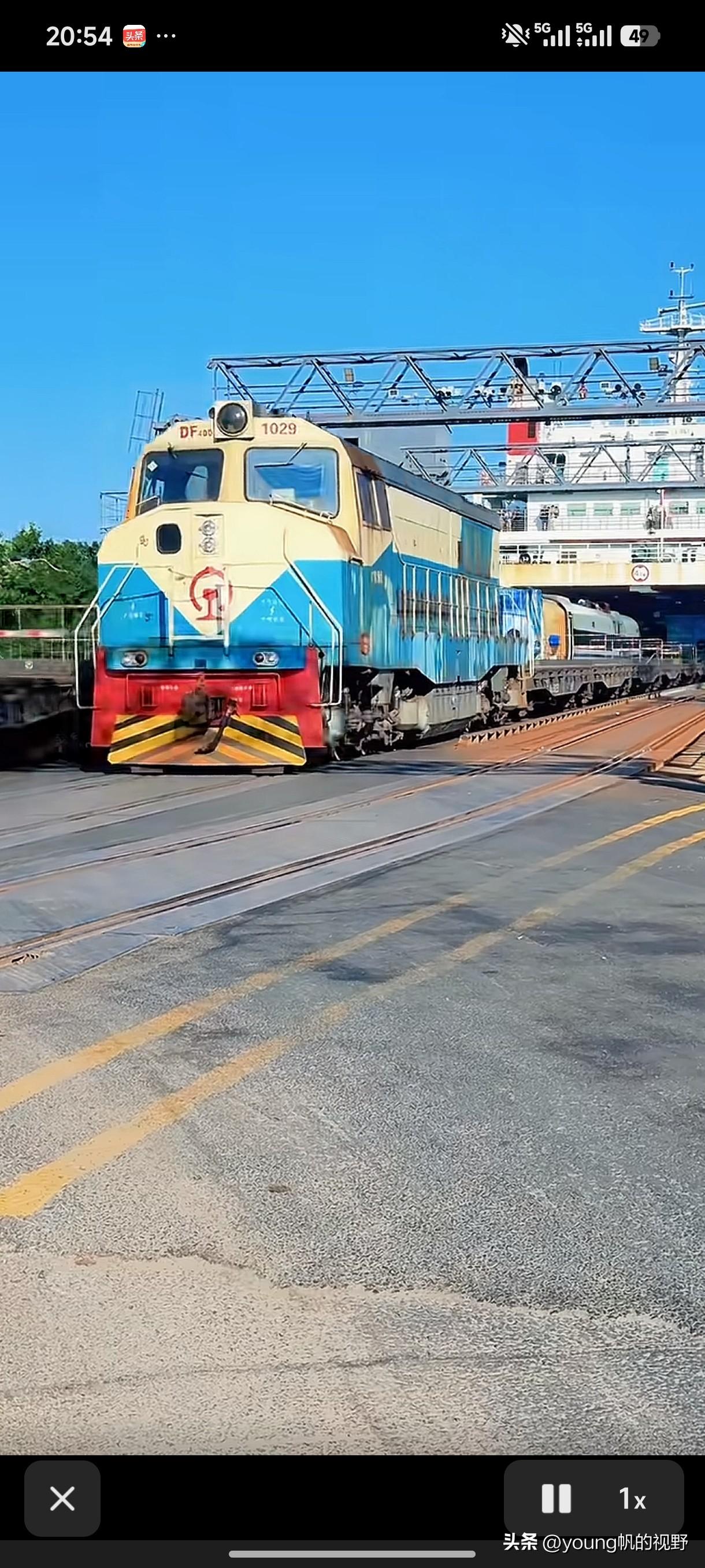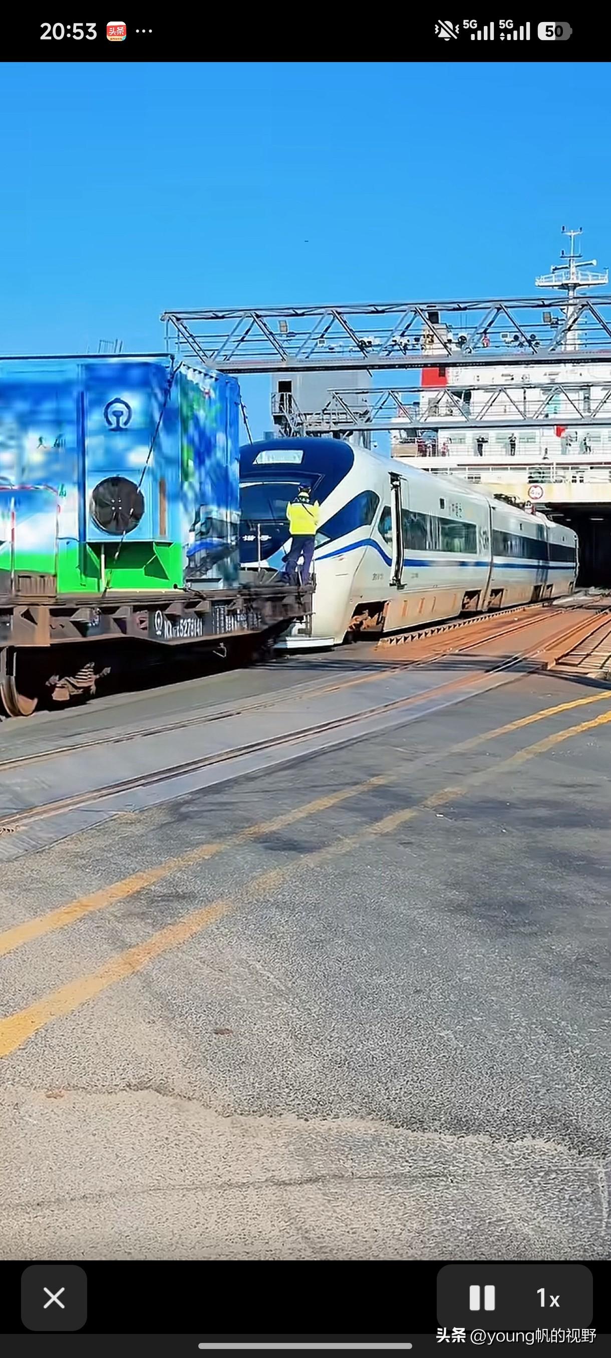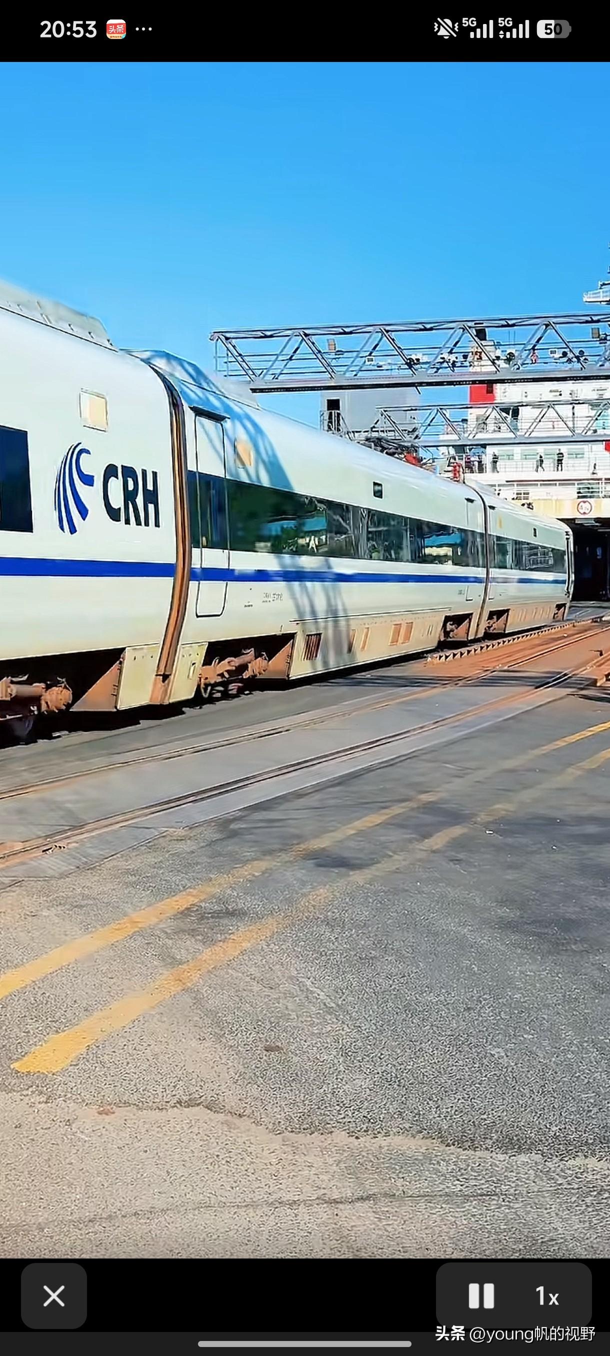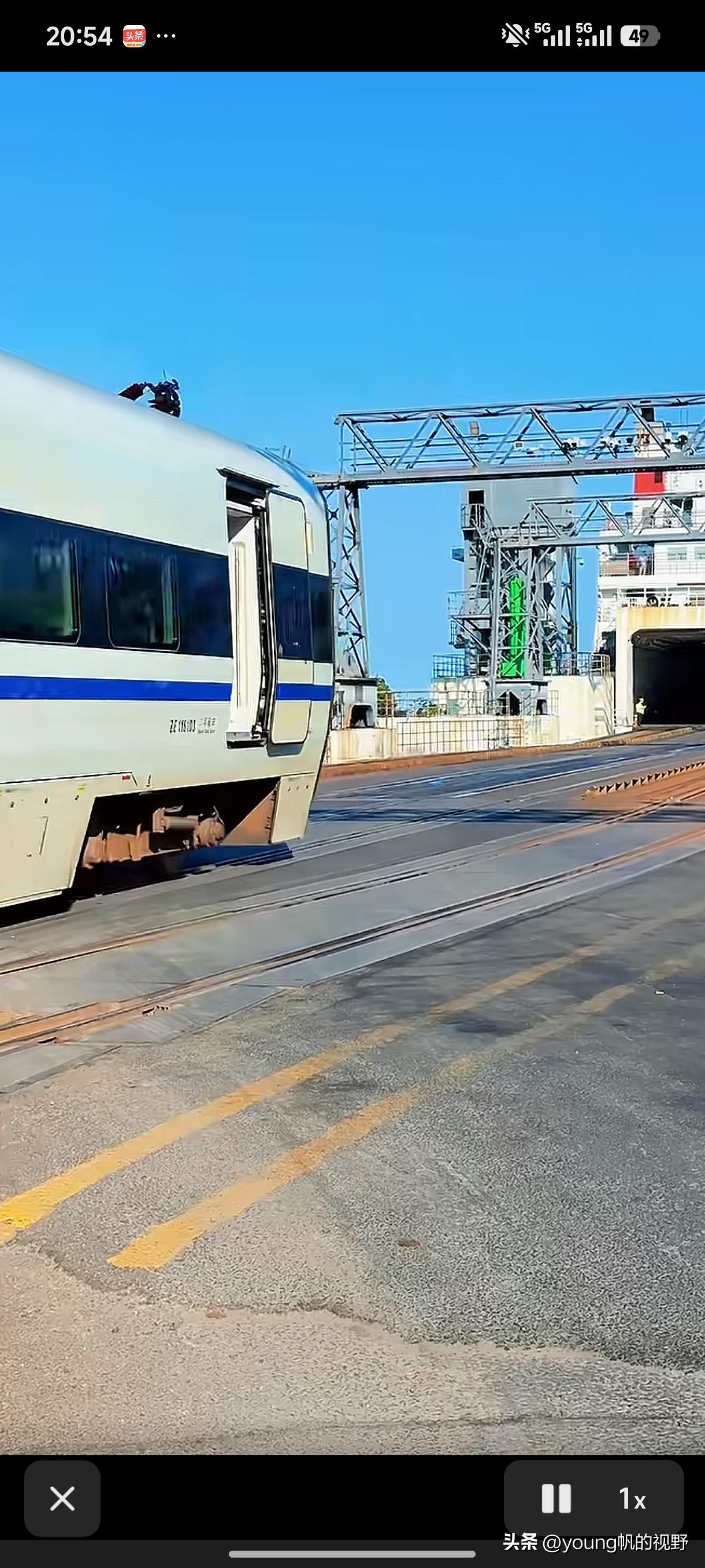 高铁动车组也有需要坐船的时候。图中的和谐号动车组是运行在海南环岛高铁上的列车。虽然平时运行在海南岛上,但到了检修时还是需要返回大陆的。由于海南岛与大陆的铁路之间并不能直接连接,因此需要借助粤海铁路轮渡来进行跨海。此时就需要借助铁路轮渡码头的DF4DD调车机车把拆分成两段后的动车组缓慢的推进轮船的船舱当中。