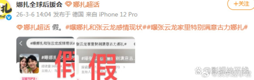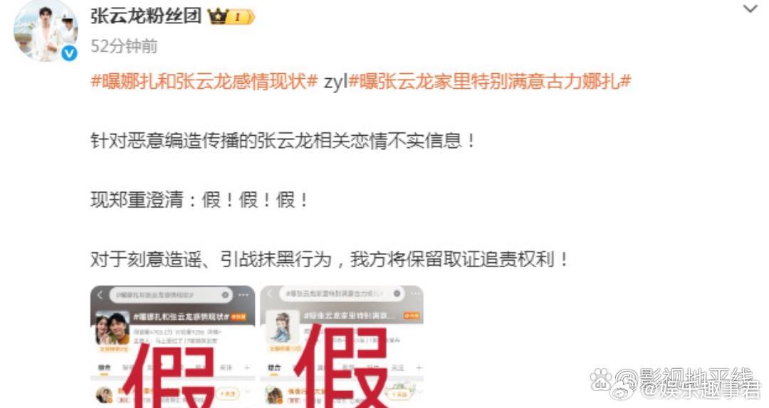 后援会辟谣娜扎张云龙感情现状传闻娜扎全球后援会辟谣:“假”。 张云龙粉丝团也辟谣:“假!假!假!对于刻意造谣、引战抹黑行为,我方将保留取证追责权利!