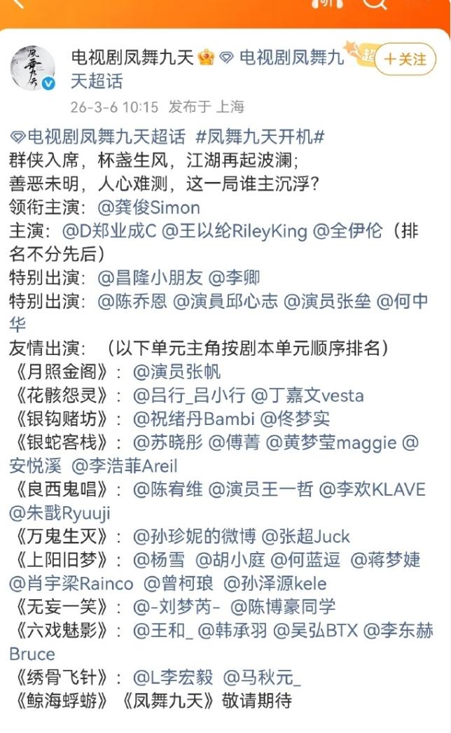 龚俊《凤舞九天》官宣! 龚俊一番大大男主,主演是郑业成,王以纶和全伊伦,阵容看着真不错,没一个单元的主演都是不太火,但很脸熟的演员,导演周靖韬,代表作《一念关山》,联合导演是梁靖宇,龚俊那部《山河令》的导演,只要曾经顶流过,即便热度下滑,也依旧是一番大男主的资源。