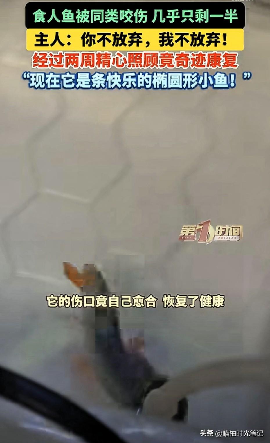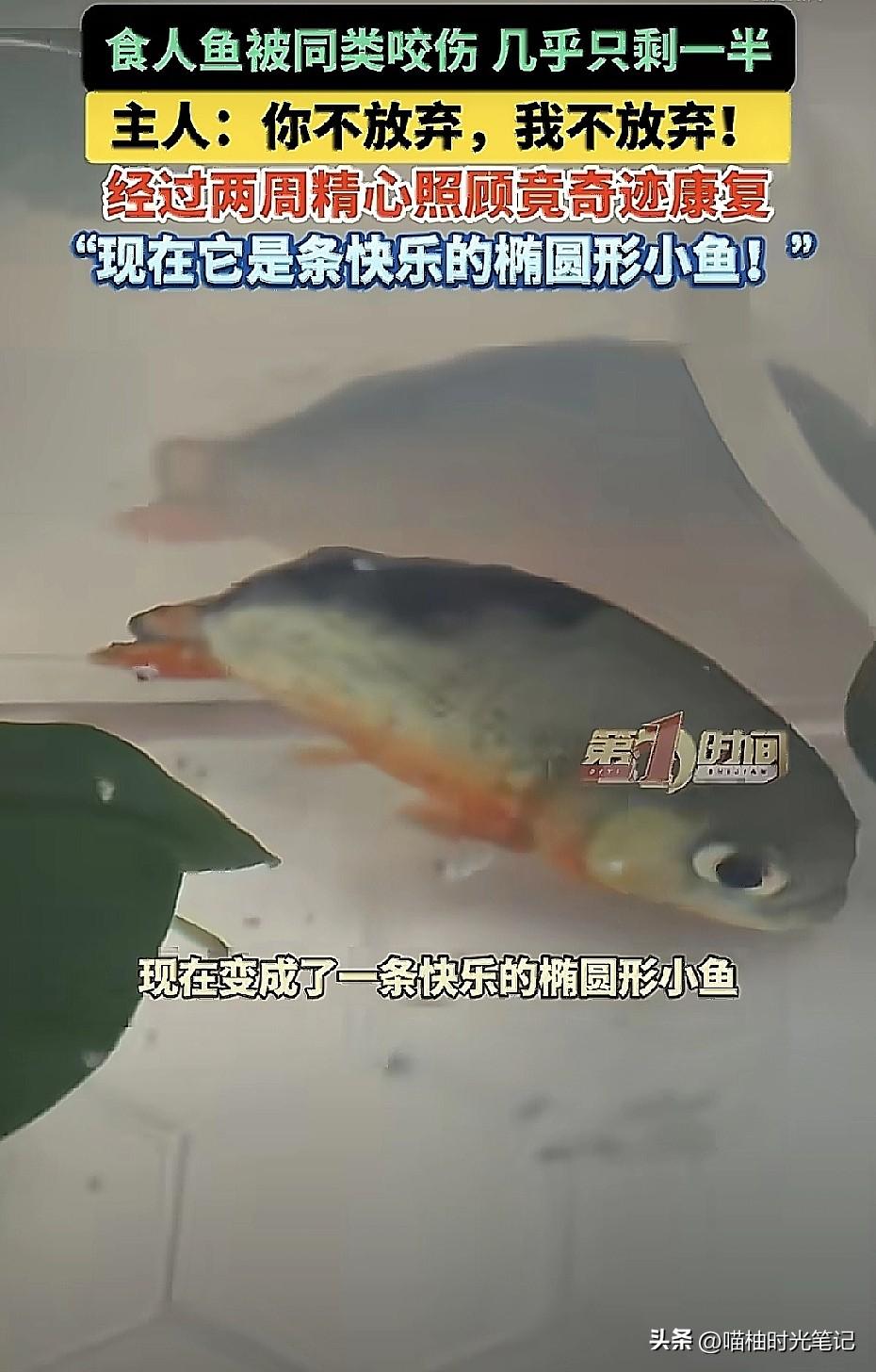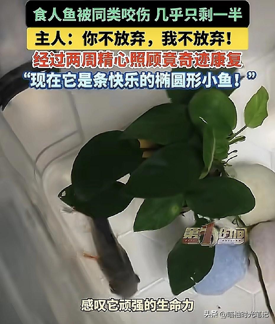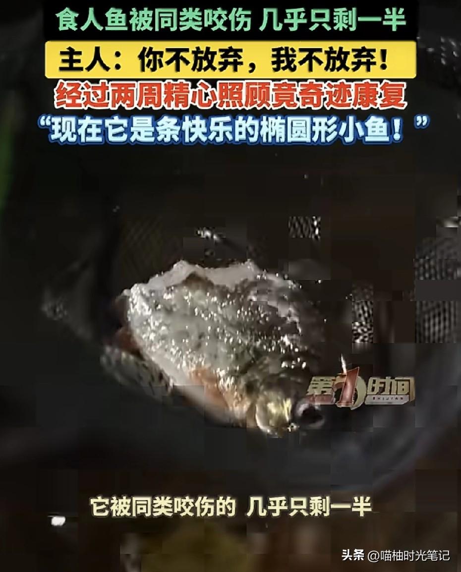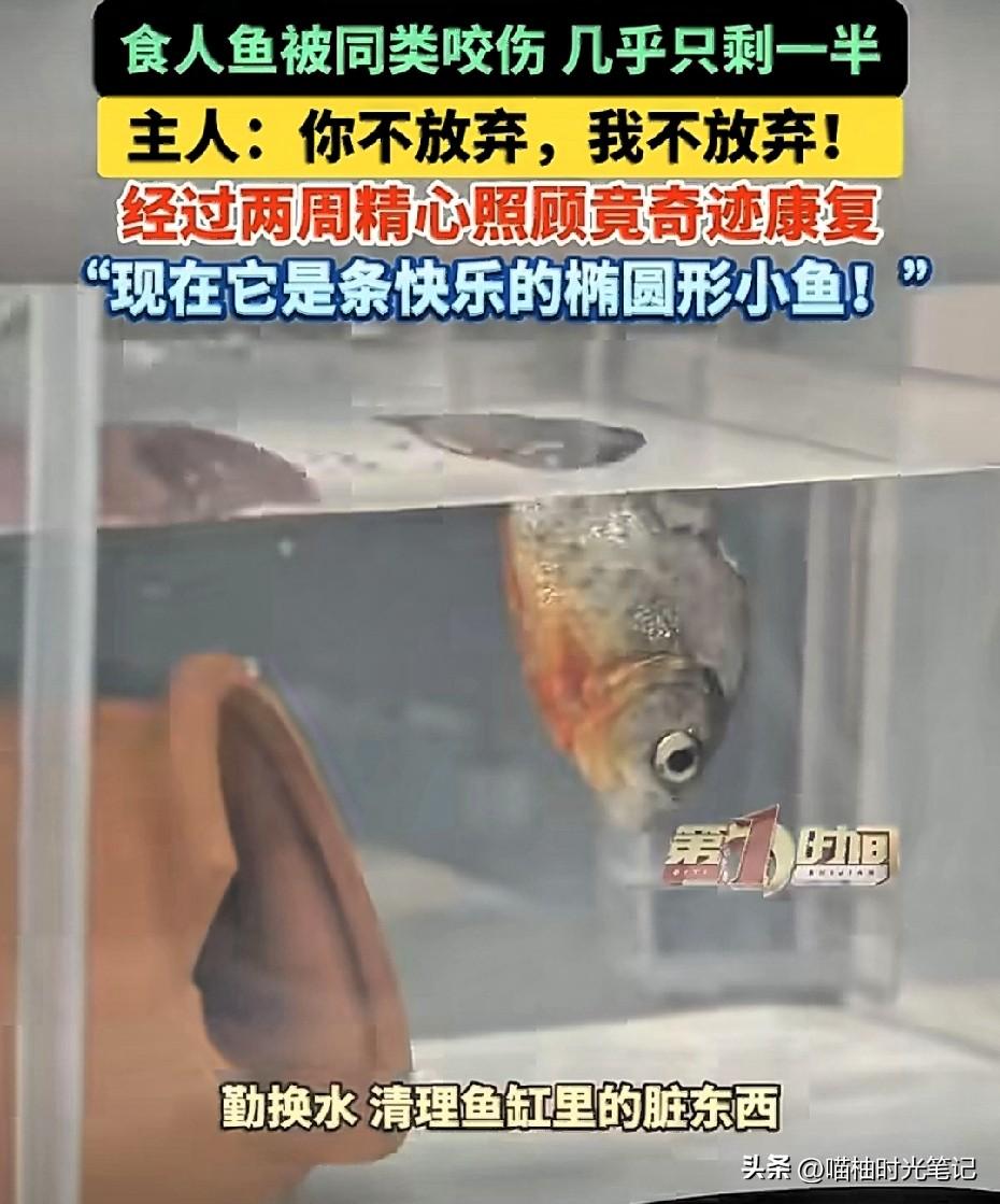 半条鱼硬刚死神两周!主人:你不放弃,我不放弃!北京一位鱼友家里养了两条红腹食人鱼,结果小的那条被大的咬得惨不忍睹,尾巴没了,身子只剩半截,内脏都露在外面,游起来跟喝醉了似的东倒西歪。这鱼都成"鱼片"了还能活?换作一般人,估计早就冲马桶了,毕竟这样,神仙来了也难救。 但这位刘先生偏不。他把"鱼坚强"捞进专属单间(单独鱼缸),每天勤换水、撒无碘盐消毒、把鱼肉剁碎了喂。就这么伺候了整整两周,你猜怎么着?伤口边缘的暗红色褪了,肉芽一点点往外冒,最后还长出了一小截新尾鳍! 现在的它,虽然变成了椭圆形的"异形鱼",但只要一摆尾,那股子生命力简直要溢出屏幕。 很多时候我们不是被困难打败的,是被"肯定没戏了"这个想法打败的。这条鱼要是会思考,估计也觉得自己完了,但它就是凭着本能硬撑。而主人的那句"你不放弃,我不放弃",才是真正的灵魂一击。 生命的韧性远超我们想象。一条鱼尚且如此,人遇到点挫折又算什么? (信源:AHTV第一时间等)