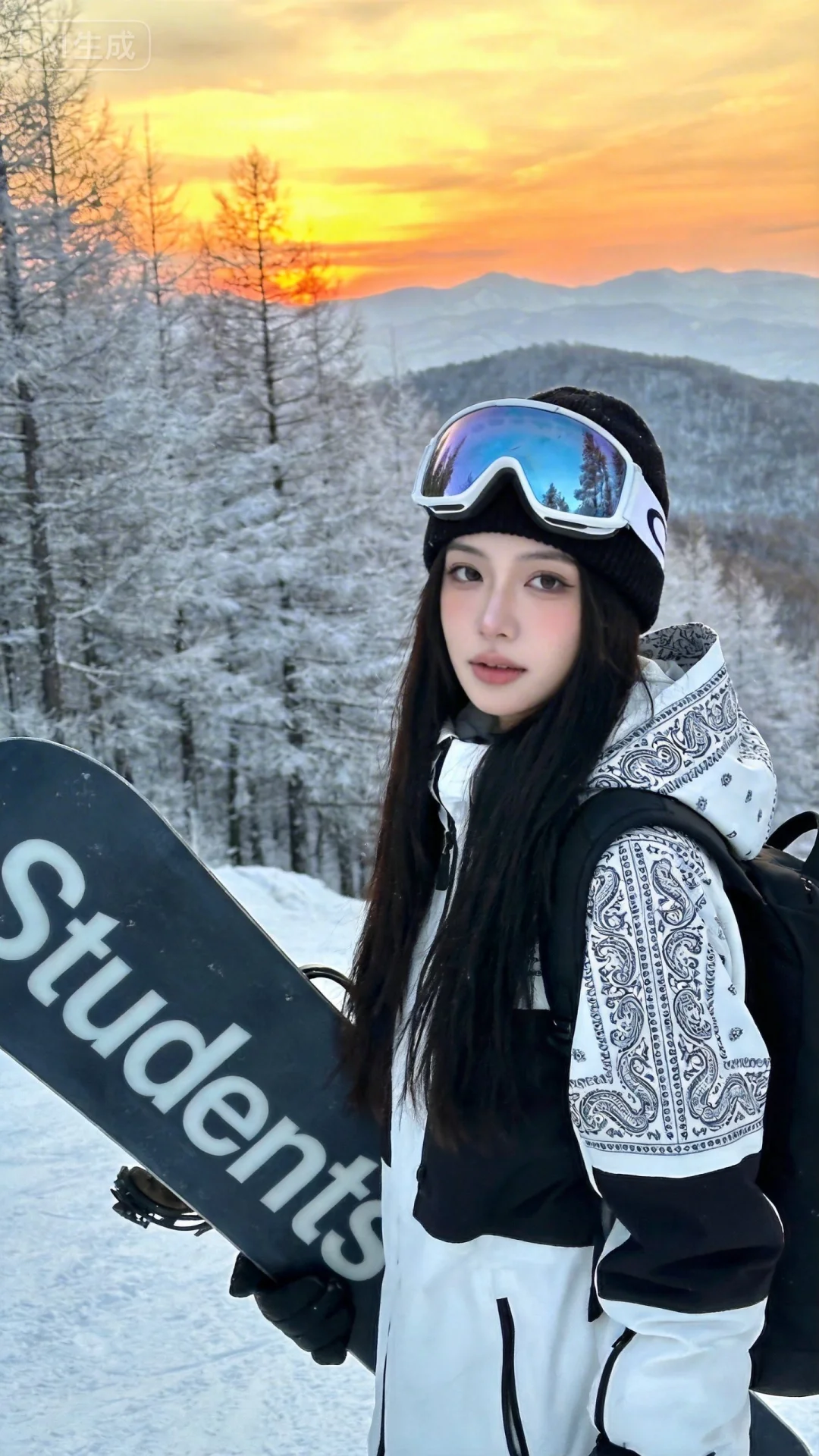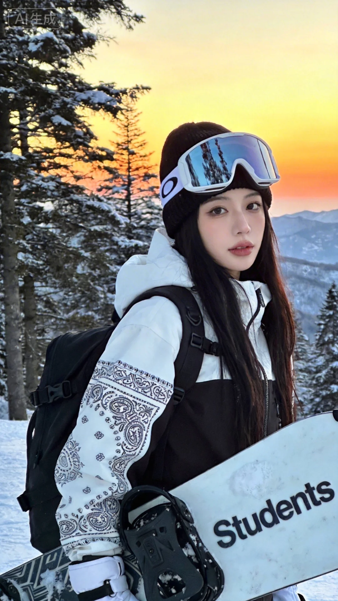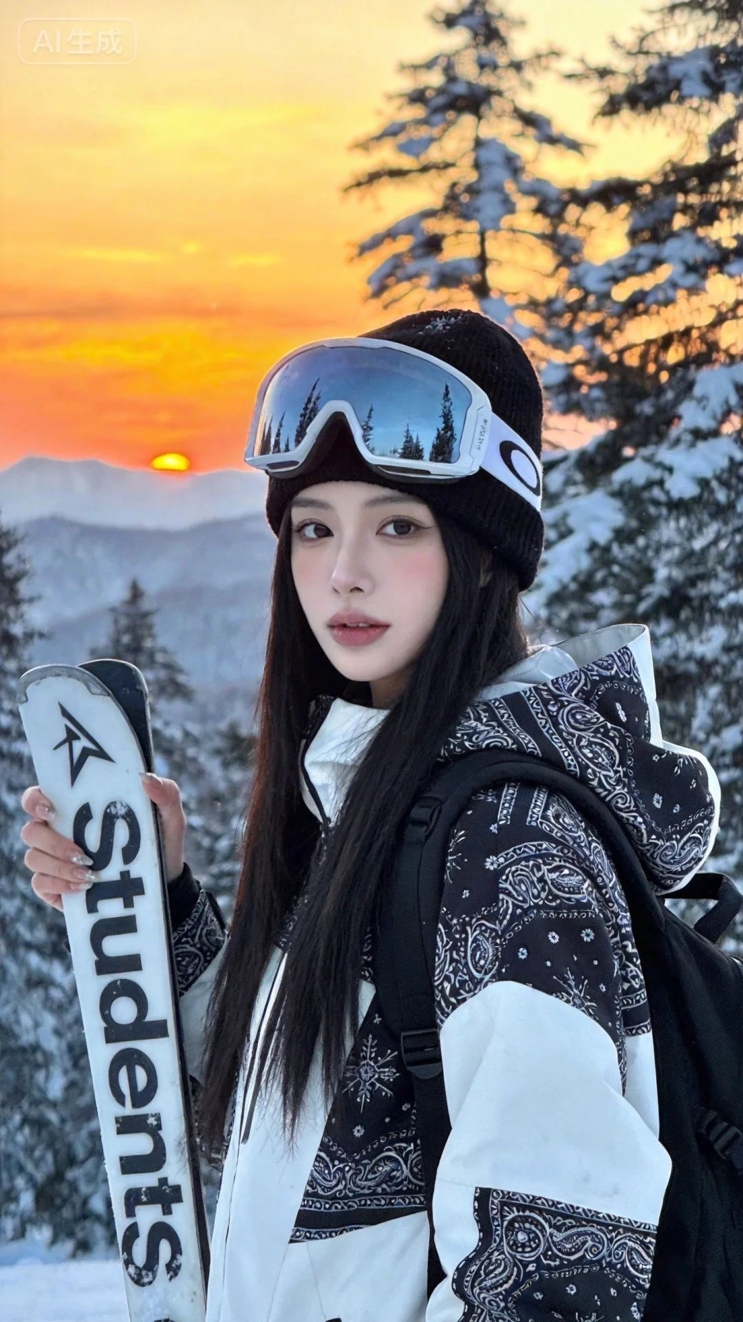 一位长发及腰模样可爱的女生,构图随意却尽显生活中的绚丽日常,人像摄影,日常快照风格,非精心构图或打光,妖冶少女,身材娇好,高颜值,冷白皮,时尚穿搭,瓜子脸尖下巴,皮肤白皙,底妆通透,肤色均匀自然,纯欲风。光线柔和自然,非均匀打光,表情自然松弛,照片毫无修饰感,带有生活真实感。ccd拍照感,真人真实,黄金比例大师摄影手,原片直出、不加修饰、本色出镜、真实细节、原生细节、随手抓拍、自然状态,绝世美人,滑雪造型的女性为主体:她佩戴黑色针织帽,搭配白色边框的大框滑雪镜(镜片反光映出雪景),身着白黑拼色繁琐符文图案滑雪服,肩背黑色背包,手持印有“Students”繁琐字体的滑雪板;场景设定在雪后山林的日落时分(背景是覆雪的树木、远处的山脉与橙黄色调的落日天空);