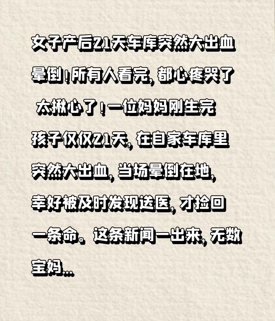 女子产后21天车库突然大出血晕倒!所有人看完,都心疼哭了 太揪心了!一位妈妈刚生完孩子仅仅21天,在自家车库里突然大出血,当场晕倒在地,幸好被及时发现送医,才捡回一条命。这条新闻一出来,无数宝妈瞬间破防,每一个当过妈的人,都看得头皮发麻、眼泪直流。 很多人不知道,产后21天,正是产妇身体最脆弱、最危险的时期。本以为生完孩子就万事大吉,可现实是,产后大出血、产褥感染、羊水栓塞、子宫复旧不良,每一个都可能瞬间夺走妈妈的生命。这位妈妈就是在毫无征兆的情况下,出血量瞬间失控,倒在冰冷的车库里,如果晚发现几分钟,后果不堪设想。 大家以为这只是个例?转折点来了:医生紧急抢救后直言,这种产后突发危象,远比我们想象得更常见。很多新手妈妈为了照顾孩子、心疼家人,硬撑着下床、抱娃、做家务,明明身体虚弱到极点,却不敢说累、不敢喊疼,总觉得“忍忍就过去了”。 她们忍着伤口的剧痛,忍着熬夜喂奶的疲惫,忍着激素暴跌的情绪崩溃,却把最温柔的一面留给孩子,把最危险的一面藏在自己心里。而最让人难过的是,很多家人只关心孩子吃得好不好、长得胖不胖,却忽略了那个刚刚从鬼门关走一圈的妈妈,正在默默承受生命危险。 产后的妈妈,不是矫情,不是脆弱,是真的在用命换孩子的命。十月怀胎的辛苦,一朝分娩的剧痛,产后恢复的煎熬,每一步都是拿健康在赌。 看到这位晕倒在车库的妈妈,真的破防了。哪有什么天生坚强的妈妈,不过是为了孩子,在拼命硬扛。愿每一位产妇都能被温柔以待,愿每一个家庭都能多一份细心、多一份心疼,别让妈妈们在最脆弱的时候,独自面对危险。 也想对所有妈妈说:你首先是你自己,然后才是妈妈。一定要爱惜自己,你的命,比什么都重要。