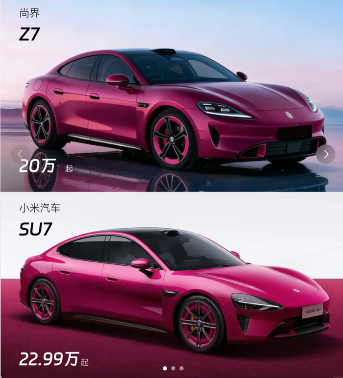 不过,新车发布后,很快被推上舆论的风口。部分网友认为,Z7在整体车身姿态和部分细节设计上,与保时捷Taycan以及小米SU7存在较高相似度。相关对比图片随后在多个汽车社区和社交平台广泛传播,使这款尚未正式上市的新车,在发布初期就卷入了一场围绕设计风格的讨论。
