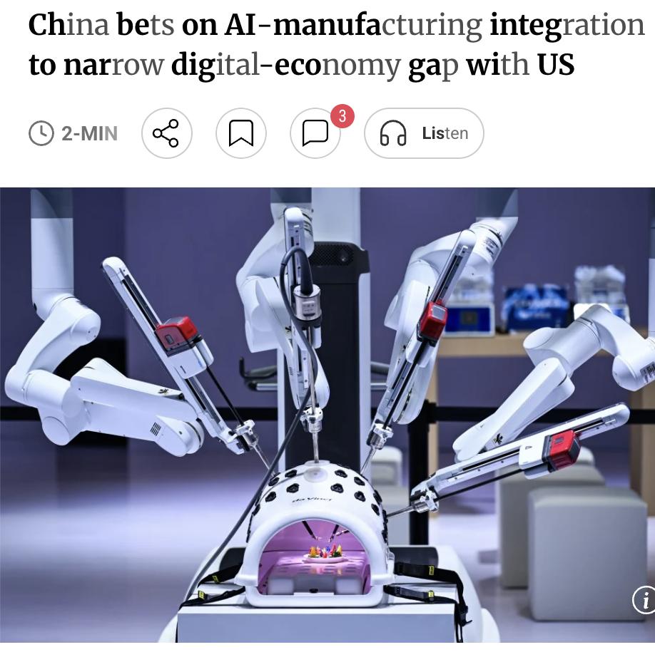 外媒:中国押注AI与制造业融合,缩小与美国数字经济差距 中国第十五个五年规划(2026-2030年)明确提出,数字经济占GDP比重将从2025年的10.5%提升至2030年的12.5%,增幅达2个百分点。 规划核心逻辑是推动AI与制造业深度融合,将数字经济增长锚定在先进制造业基础上,而非单纯依靠互联网消费经济。规划提出28项重大工程,聚焦强化产业基础与竞争力、培育新兴产业和新增长点、推进前沿技术突破三大方向。 2026年具体部署包括:升级5G网络、推动工厂设备联网,实现更高程度的自动化、数字化和智能化生产,同时打造国家级先进制造业集群。