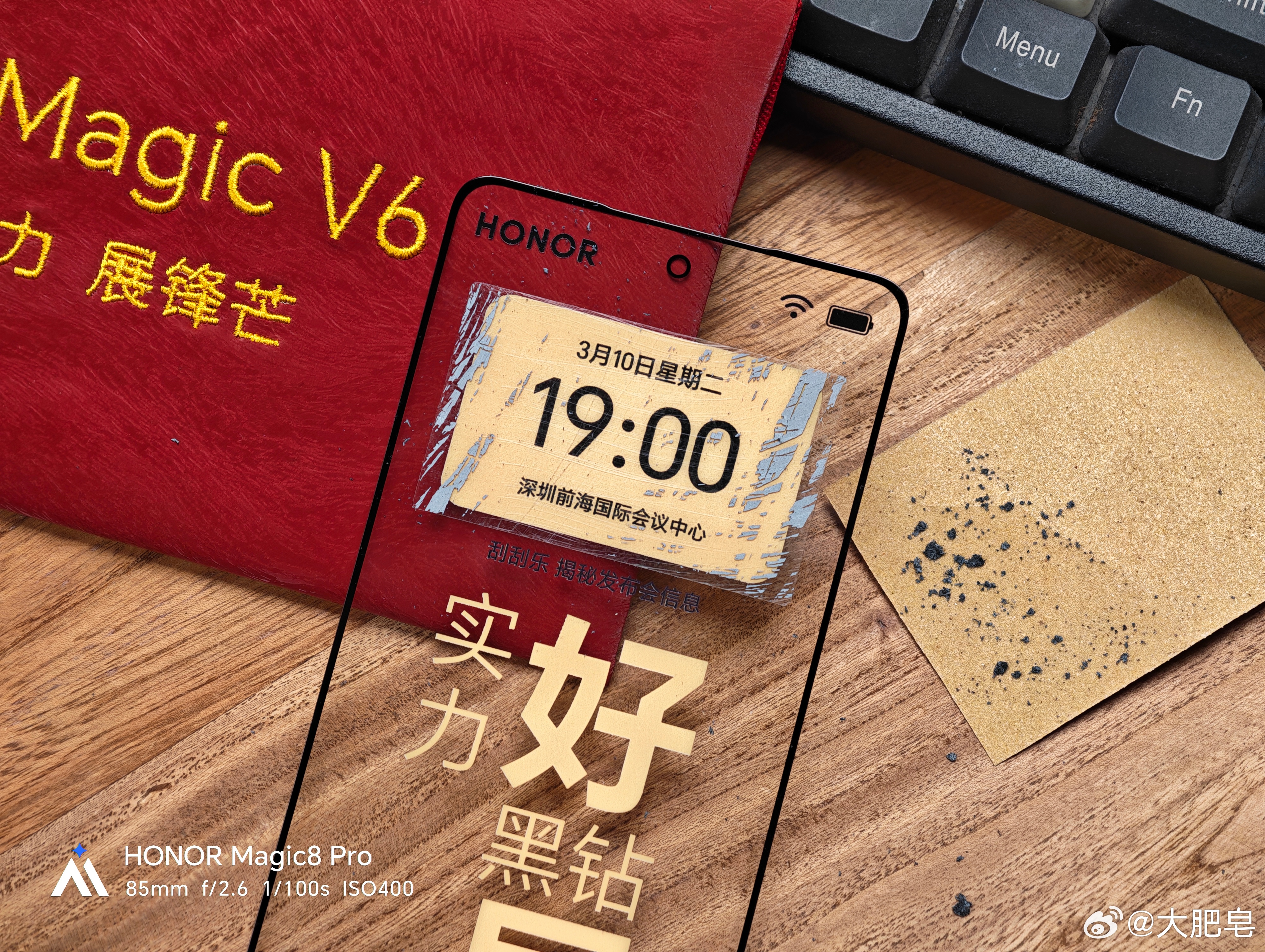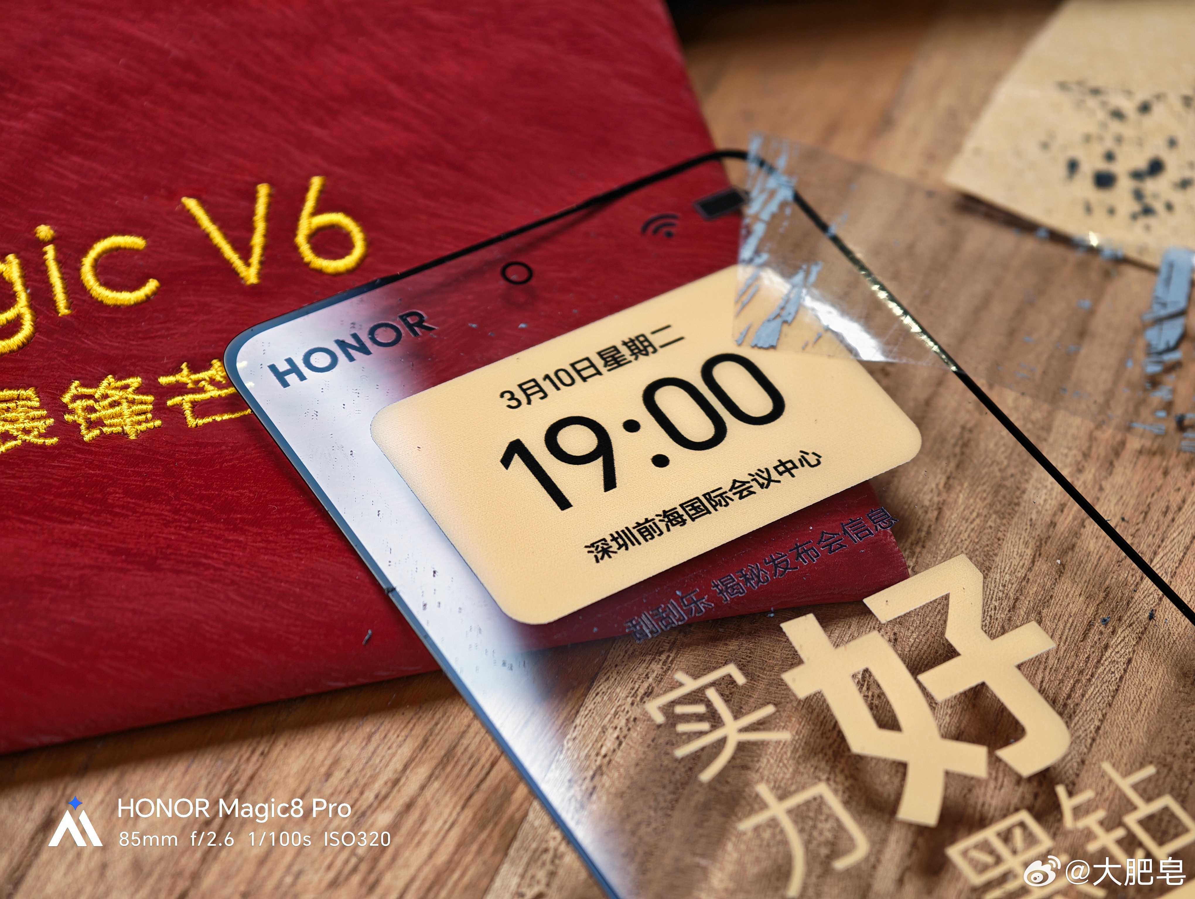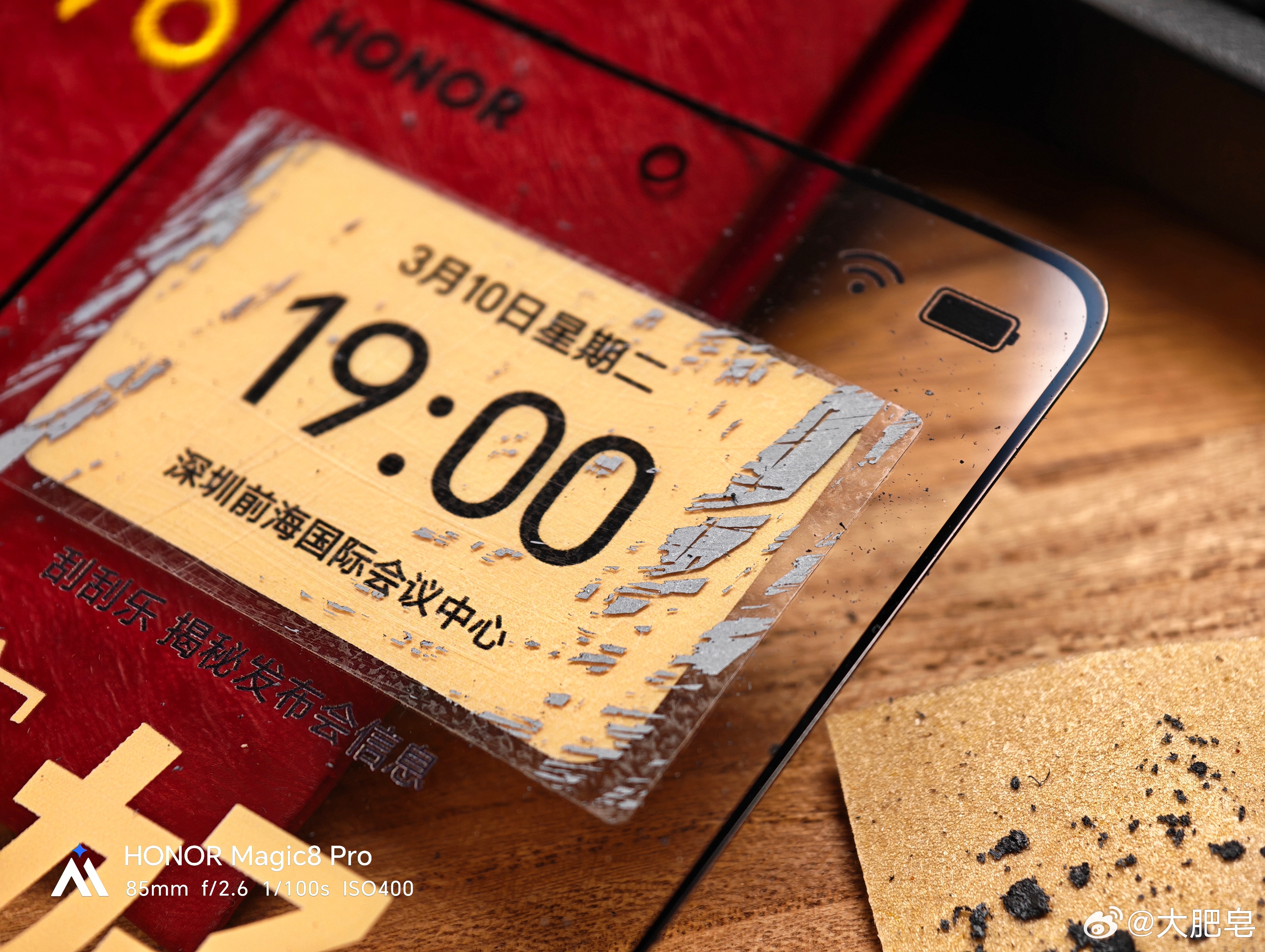 你别问我怎么知道的,我拿到这个邀请函,我就全明白了荣耀想干什么。它这里有一个砂纸,我用这个砂纸把上面的这个图层刮掉之后,看到了这次发布会的时间,大家也可以牢记一下这个时间,记得来看。