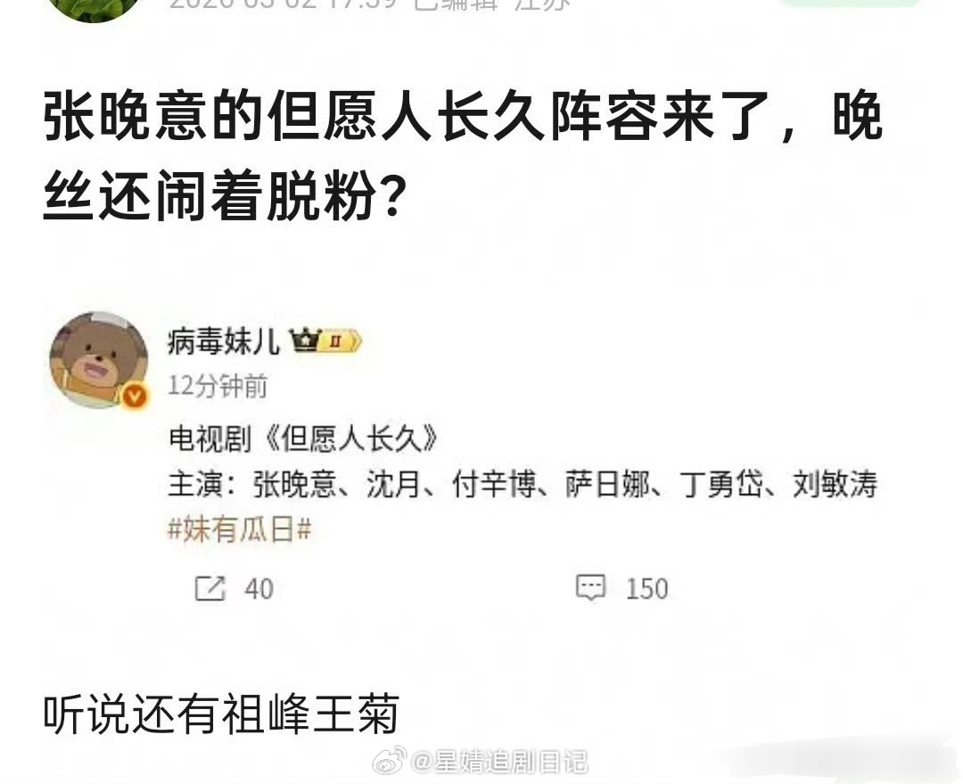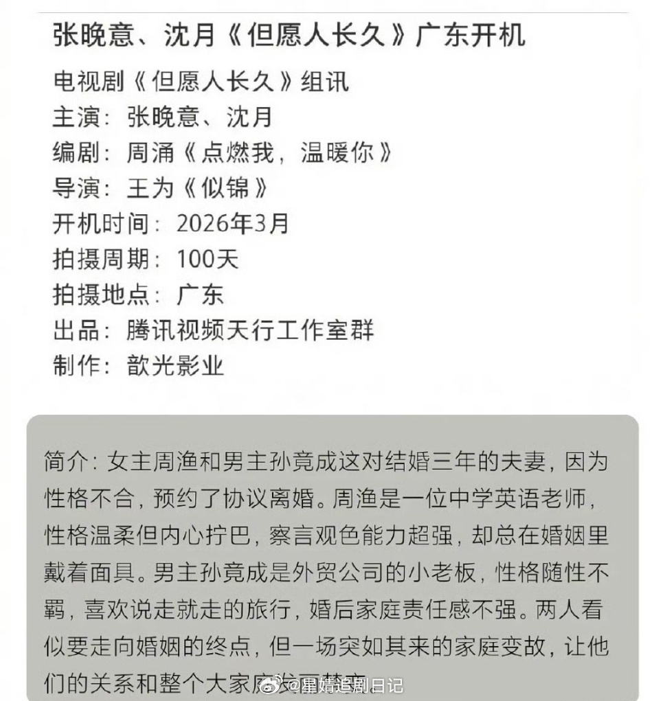 这阵容不是很好吗?张晚意沈月新剧《但愿人长久》这剧配角配置还挺好的~萨日娜、丁勇岱、刘敏涛三位重量级老戏骨。男二竟然是付辛博 好多人啊 ,这配角阵容真的算挺好的了…还脱个der