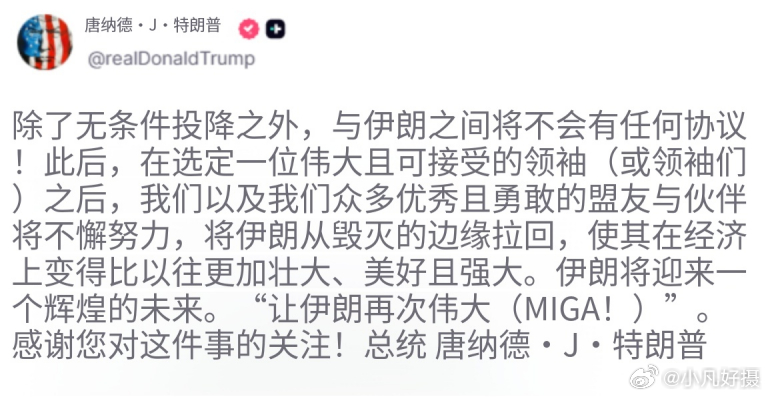 特朗普又发帖了:“除了无条件投降,不会与伊朗达成任何协议!”伊朗外长说对抗美以已是胜利美以伊最新局势黄媒不会说的真相