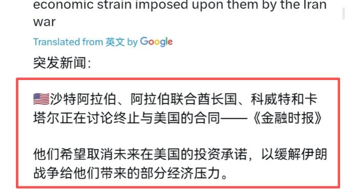 据英国《金融时报》报道,目前沙特、阿联酋、科威特和卡塔尔正在讨论终止与美国的合同,希望取消未来在美国的投资承诺,以缓解伊朗战争给他们带来的部分经济压力。 先说这仗烧得有多狠,霍尔木兹海峡这全球四分之一石油运输的“咽喉要道”,现在被伊朗管得死死的,船都不敢随便过。 沙特阿美盈利颇丰的炼油厂遭无人机重创,出现巨大破损,日产油量锐减50万桶,与此同时,阿联酋迪拜最大港口陷入停摆,进出口贸易受阻,陷入困局。 油价跟坐火箭似的,一天涨了13%,冲到82美元一桶,要是封锁再持续,说不定能破200美元,沙特财政收入直接少了一大块,毕竟油卖不出去,钱也赚不着。 更气人的是,美国之前拍胸脯保证“安全”,结果也门胡塞武装打以色列的时候,沙特防空系统自动拦截了导弹,美国却翻脸不认人,这“安全承诺”彻底成了空头支票。 四国此番“断美”之举,实则不愿再做冤大头,既不愿为美国对伊行动埋单,也不想深陷“安全 - 债务”的恶性循环,力求摆脱无谓的损耗与束缚。 谈及沙特等国的“自救良策”,往昔沙特与美国签订为期50年的石油美元协议,规定石油交易须以美元结算,且所获收益还需用于购置美国国债。 现在沙特不干了,直接撕合同,把6000亿美元投资转向中国,建AI数据中心、搞燃气轮机、修萨勒曼国际机场,样样都来。 阿联酋举措更为激进,将高达1.4万亿美元的对美投资尽数倾注于半导体、AI等高科技领域,其意在搭乘美国“友岸外包”之便车,同时伺机削弱中国在相关领域之影响力。 可伊朗战争一打,沙特王储萨勒曼直接通知美国:石油美元协议不续了,以后卖油可能用人民币、欧元、日元结算,少让全球依赖美元。 这波“去美元化”操作,既是能源转型的压力,也是中东国家想自己掌控经济命脉的突围。 最后谈谈地缘博弈新玩法,美国妄图凭借“三不政策”,即不出地面部队、不搞国家重建、不担长期责任,继续稳坐中东老大之位,然而,伊朗战争狠狠打脸,暴露其战略收缩底牌。 沙特等国这波“断美”操作,就是对美国霸权逻辑的反击:既不想替美国打仗,也不想被美国绑死。 中国则用“一带一路”当纽带,在伊朗投了200多亿美元,搞能源、基建、5G,形成经济生命线。 三国海军在恰巴哈尔港搞联合军演,直接对美军航母形成威慑,这种“非对称合作”模式,正在重新塑造中东的地缘格局。 说句实在的,沙特等国的“断美”操作,本质是霸权思维和多极世界的碰撞,美国想靠打仗维持单极主导,结果越打越亏,中东国家则靠经济转型和战略自主找活路。 真正的安全并非凭借武力恫吓他人来维系,武力不过是一时的威慑,难以构筑长久安稳,唯有依靠规则与合作共赢,方可营造持久、稳固的安全之境。 当沙特毅然“断美”,当中国以“一带一路”促全球共享发展,世界终会领悟:和平之基,在于实力与理性达至平衡,在于公义与共识得以构建。 正如中方所说,“海洋的和平、安宁、繁荣关乎各国共同利益”,在这场地缘博弈中,唯有摒弃“零和思维”,拥抱多极合作,方能实现真正的安全与繁荣。