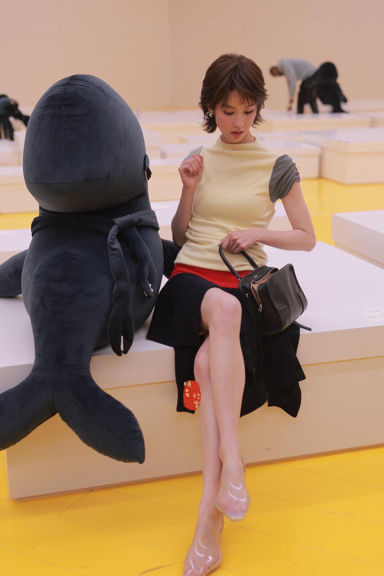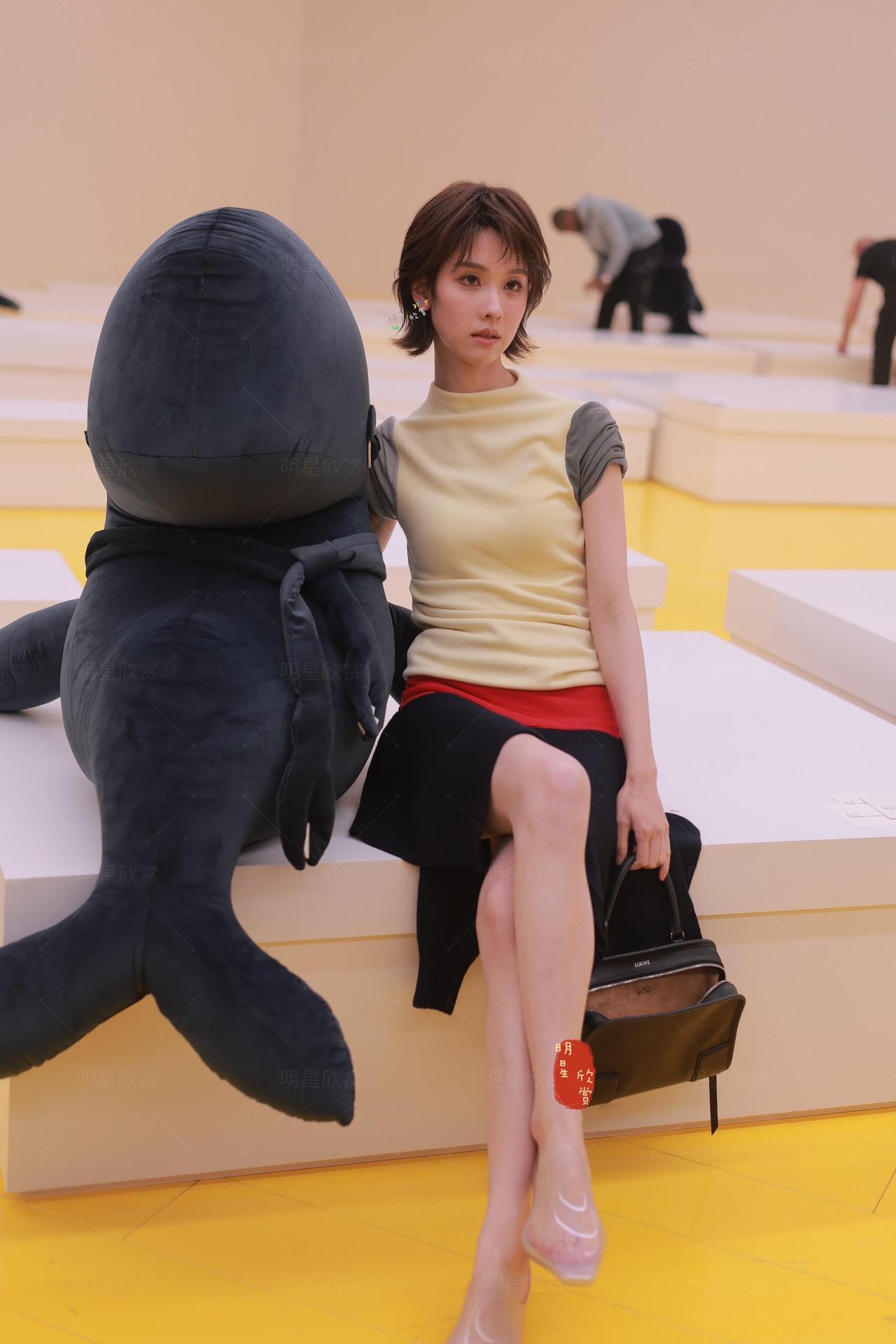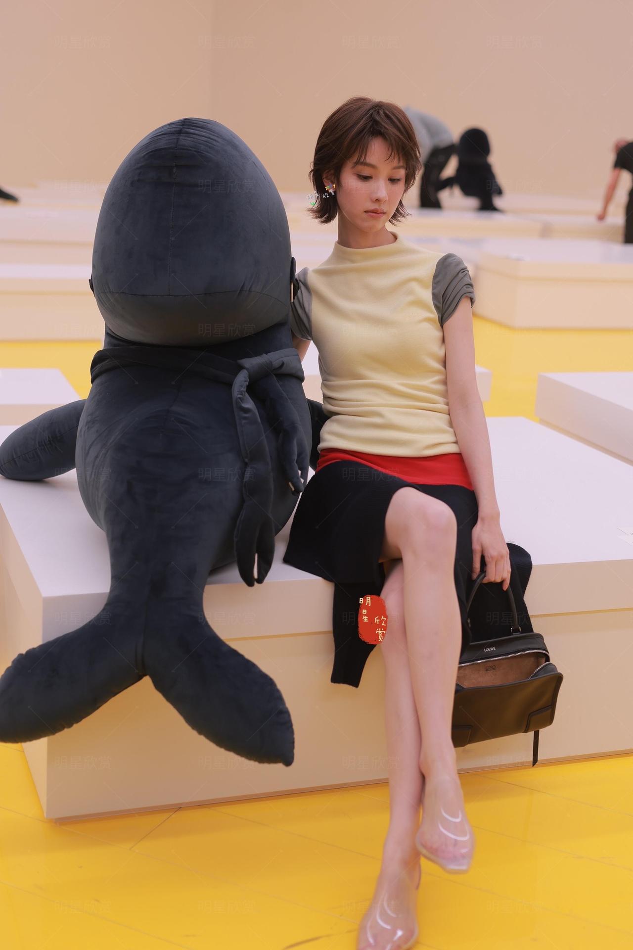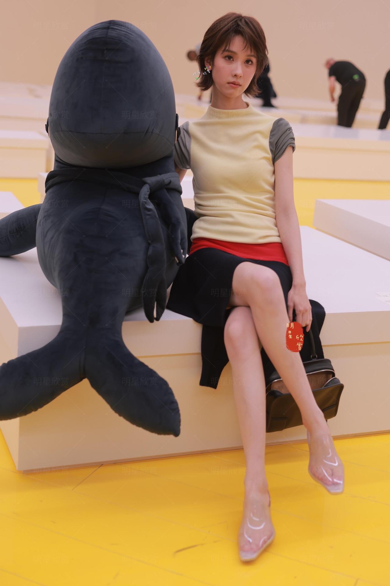 陈都灵巴黎看秀现场交叉着腿,自信大方,短发俏皮明媚!