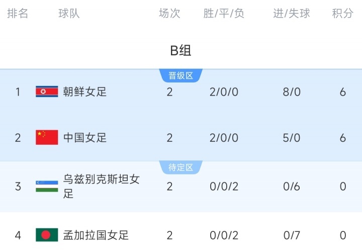 女足亚洲杯小组赛B组第2轮今天结束两场较量,朝鲜女足5-0孟加拉国女足,中国女足3-0乌兹别克斯坦女足。