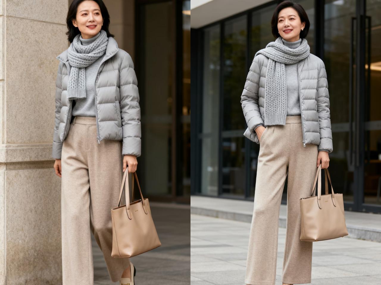 中年女性春季选择灰色+大地色穿搭,优雅又显贵 开春后穿搭,讲究的清爽利落和轻盈,很多姐妹到了这个季节就不知道怎么穿为好。颜色深的服装显暗沉没精神,颜色太艳又显浮夸,无法驾驭,而颜色过浅,又被说是扮嫩。 其实,四五十岁中年女性,开春选择灰色+大地色穿搭就比较合适。灰色低调冷静,大地色温柔沉稳,与我们这个年纪的成熟稳重气质非常匹配。 两种颜色组合在一起,不用多余配饰点缀,就能穿出质感高级气质,优雅显贵。而且这组配色不挑肤色和身材,大多数人都适合穿着。 日常出门,选择一件款式合体的灰色毛衣,搭配驼色直筒裤就很好看。要是觉得这样穿太普通,可以选择一件白色高领衫或T恤穿在毛衣下面,露出白色袖口、领子、下摆,增加层次感和看点。 如果和朋友逛街,选择灰色翻领毛衣和棕色皮质A版裙组合,不仅显白,脖子线条还显得更修长,下半身缺陷也能完美遮住,轻松穿出遮肉显瘦显质感造型,优雅显贵不张扬。 春季的气温变化无常,如果遇到倒春寒天气,可以穿上灰色短棉服,内搭同色系打底衫增加保暖,再穿上驼色羊毛裤和同色系鞋子,让双腿看上去又长又直。全身搭配只有2种颜色,简约高级,造型保暖轻盈显身高。 除此之外,灰色开衫和T恤也可以用来和大地色下装搭配,穿出休闲随性的造型,可以根据衣橱里的服装灵活掌握。 总之,这两种颜色单品组合,随便搭配都不容易出错,只要全身搭配,色调不要过于暗沉就可以。灰色系职场穿搭 浅灰色穿搭 灰色气质穿搭