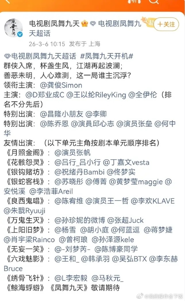 龚俊《凤舞九天》官宣!龚俊一番大大男主,主演是郑业成,王以纶和全伊伦,阵容看着真不错,没一个单元的主演都是不太火,但很脸熟的演员,导演周靖韬,代表作《一念关山》,联合导演是梁靖宇,龚俊那部《山河令》的导演,只要曾经顶流过,即便热度下滑,也依旧是一番大男主的资源。