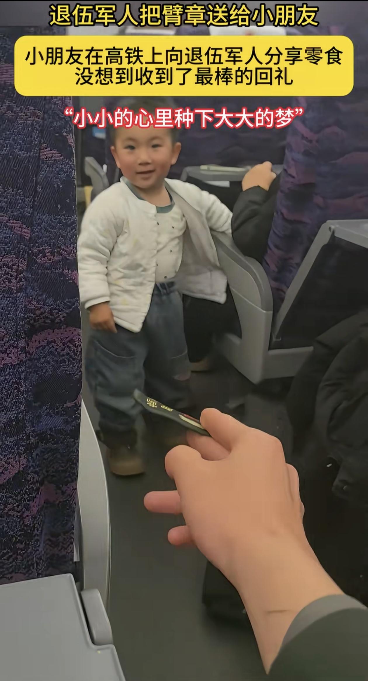 一颗糖换一枚臂章,这才是最动人的“双向奔赴”✨ 3月1日,江苏高铁上,小男孩浩浩攥着橘子糖,怯生生递给邻座的退役军人李先生。孩子的目光,一直追随着李先生贴身口袋里露出的臂章边角,眼里满是光。 李先生蹲下身,与孩子平视,慢慢拿出那枚珍藏了8年的陆军臂章。浩浩的妈妈连忙推辞:“这太贵重了!”李先生却认真地说:“送给有梦想的孩子,更有意义。” 拿到臂章的浩浩,立刻挺直腰板,敬了个稚嫩的军礼。回家后,妈妈把臂章精心装裱起来。浩浩每天都会对着相框念叨:“我要好好吃饭,长大当解放军。” 这哪里是一颗糖换一枚臂章,分明是一场精神的接力。孩子用纯真的善意,换来了一份沉甸甸的信仰;老兵用珍藏的荣誉,在小小的心里,种下了大大的梦。 最好的爱国教育,从来不是说教,而是这样一个弯腰、一次赠予、一句“希望你接过接力棒”。 退役军人 精神传承 爱国教育 双向奔赴的温暖