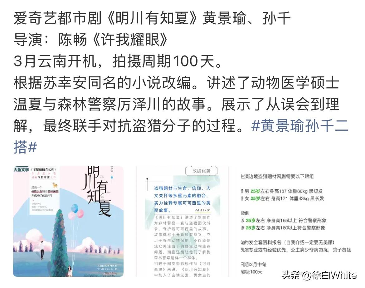 3月6日,黄景瑜新剧《明川有知夏》开拍在即,女主换成了二搭的孙千! 黄景瑜粉丝想要,黄景瑜粉丝得到,可能连黄景瑜孙千自己都没想到,他们还能有二搭,黄景瑜是新剧开拍在即不得不拍,孙千是新剧播出的成绩不错,有女主戏就拍! 一切就是那么的凑巧,明川有知夏剧组估计也是没办法了,临时换人,找合适的女演员真不容易,孙千确实是最佳人选!