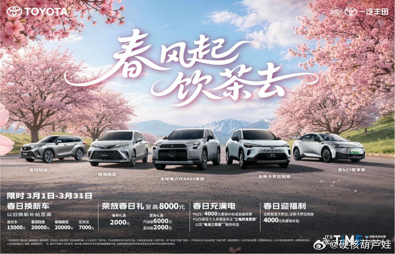 阳春三月,万物焕新。为回馈广大消费者的长期信赖,一汽丰田正式启动“全明星车型春日限时福利”活动。即日起至3月31日,旗下荣放、bZ双子星、卡罗拉锐放、皇冠陆放、格瑞维亚、普拉多、亚洲龙等重磅车型齐聚献礼,以四重诚意好礼、真金白银的补贴政策,让每一位用户都能在这个春天轻松拥抱理想座驾。