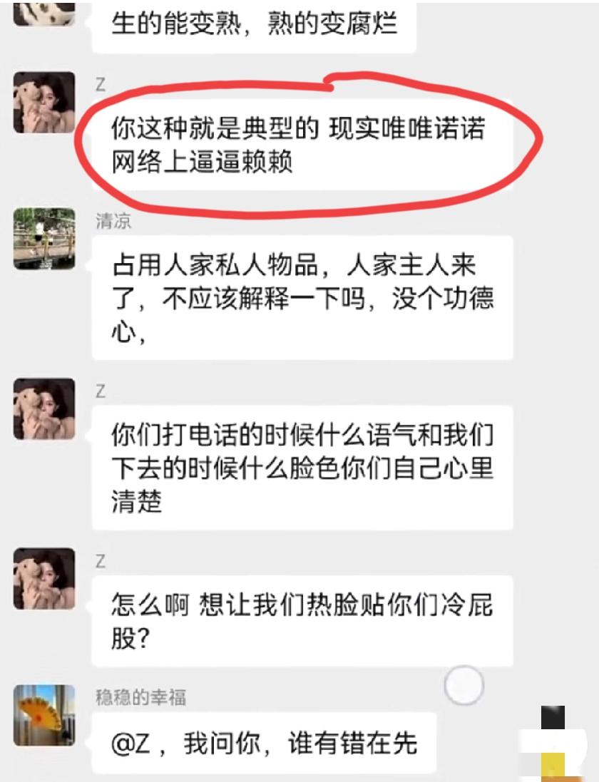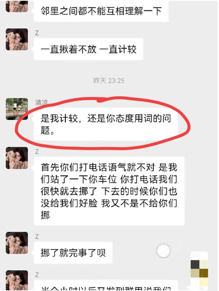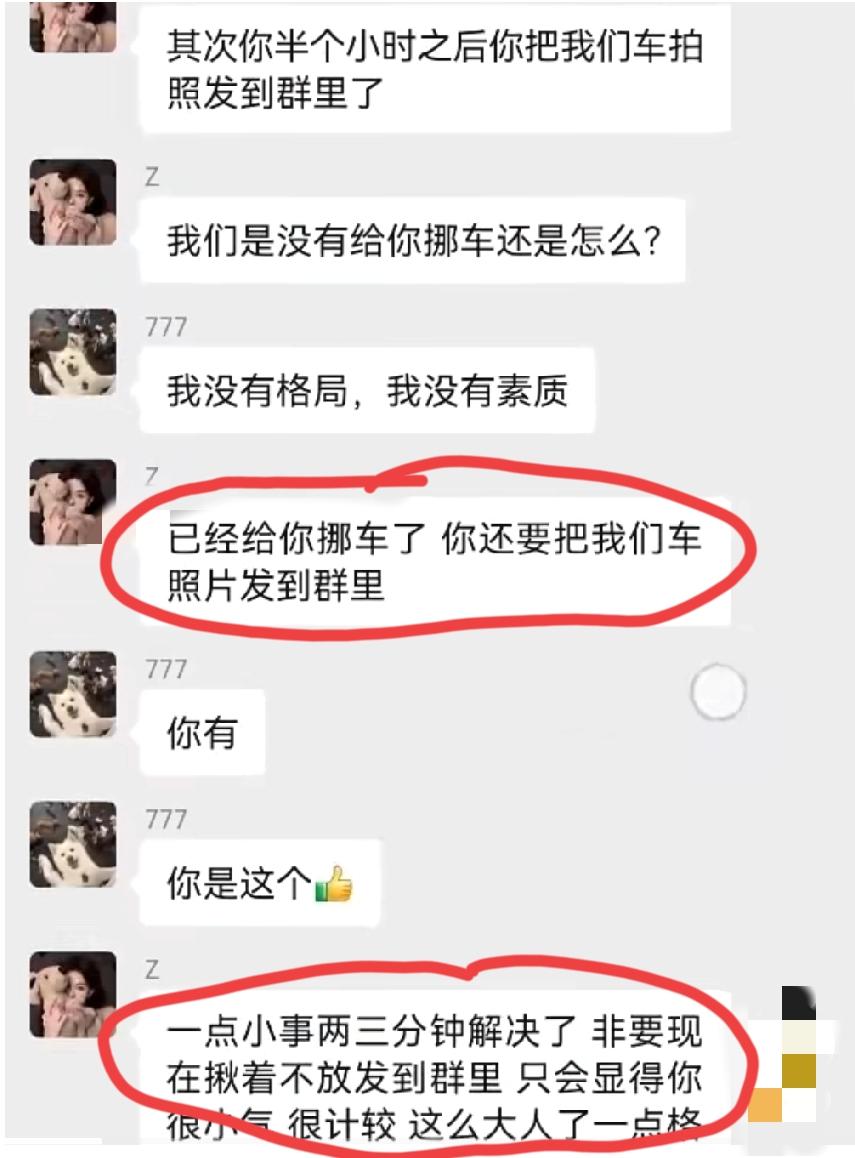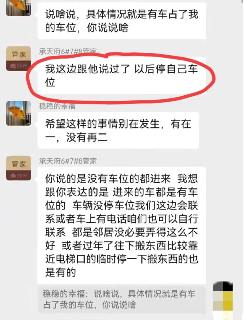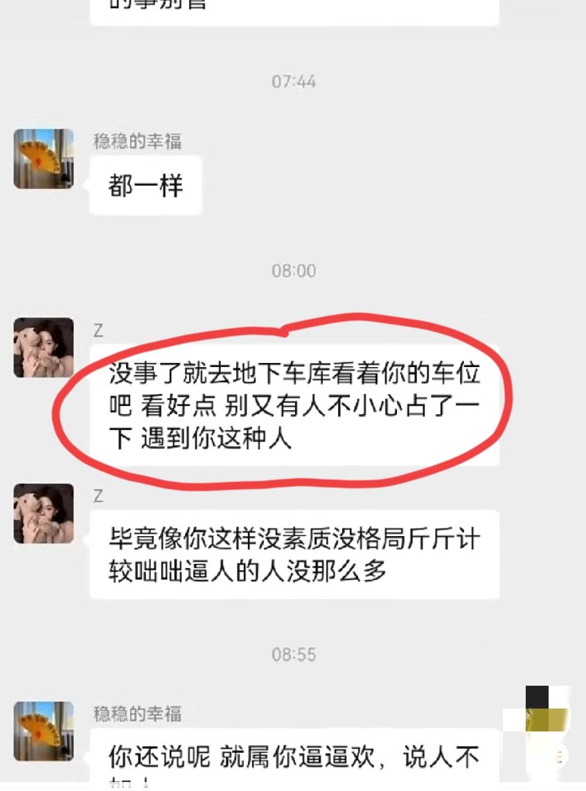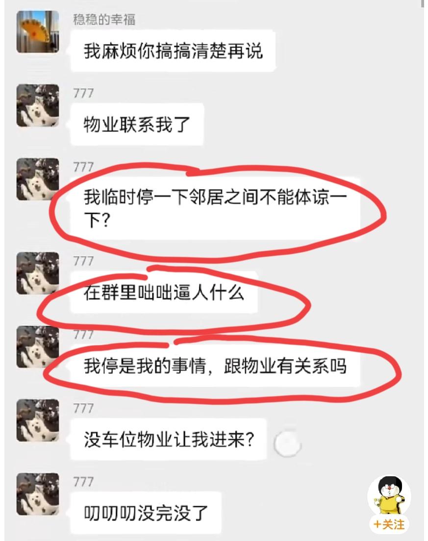 车位被占,车位主人发业主群通知挪车,从晚上9点不到,一直吵到了12点多,这还不解气,第二天早上继续吵,双方的对话把一众网友看乐了…… 大概的经过就是这样的:这位“777”占了“稳稳的幸福”的车位,“稳稳的幸福”业主群里面喊车主挪车,并阴阳了一下物业,这位“777”一上来就口气不好:“我临时停一下,邻居之间不能体谅一下吗?在群里咄咄逼人干什么,我停是我的事,跟物业有关系吗”。这之后,双方的骂战就开始了,接着“Z”和“清凉”也下场了,“Z”是站队“777”的,“清凉”是站队“稳稳的幸福”的。 我们且不说这四人在群里面骂来骂去究竟谁对谁错,就这个物业管家的水平也是属实堪忧,实际上这场骂战他多多少少有点责任,至少有拱火的嫌疑。她没有做出公正的回复,反而站抢车位的那边,并主动为抢车位的行为解释,反叫被占车位的业主理解。 评论区诸位网友,你们觉得呢?