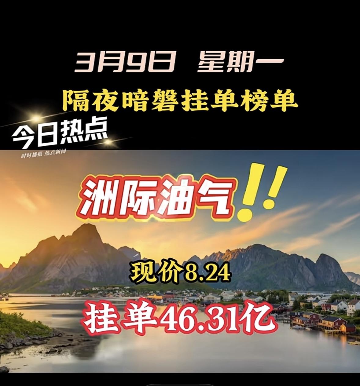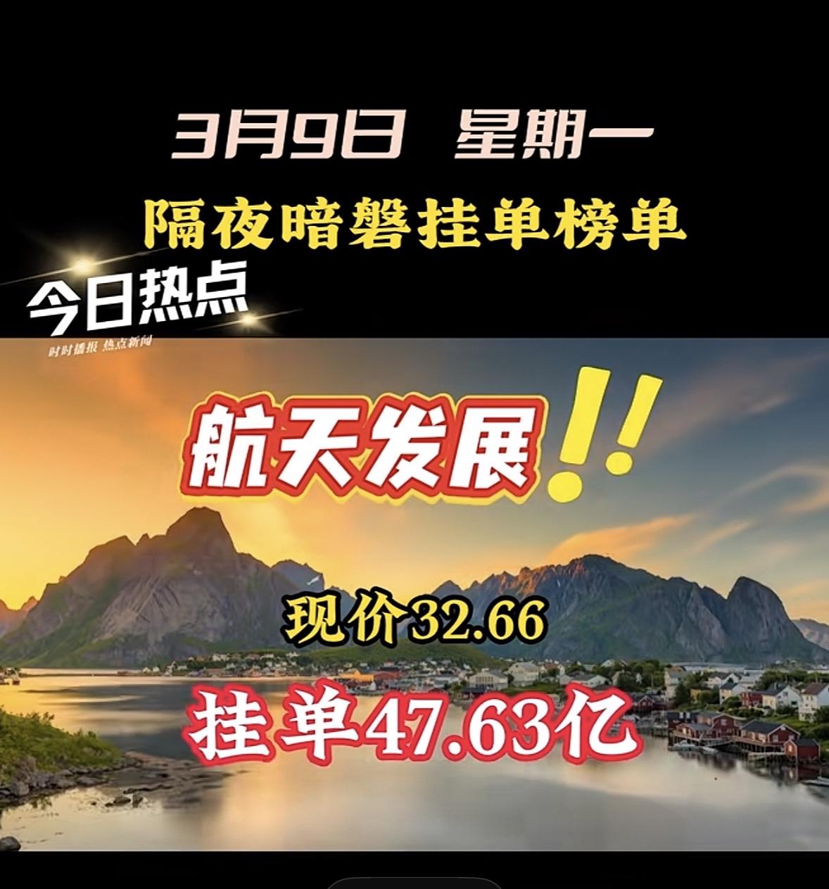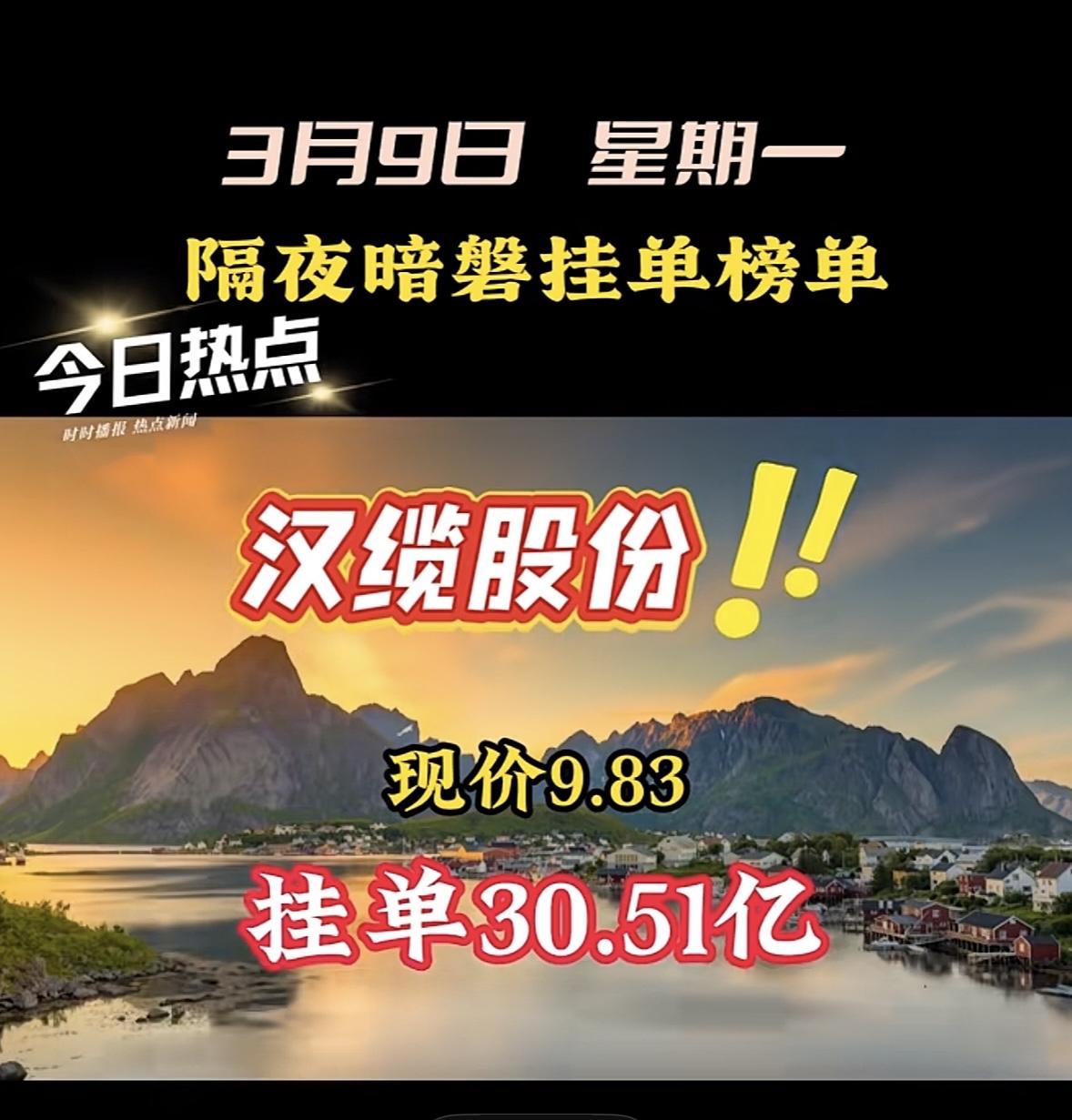 3月9日星期一暗盘隔夜挂单前8名个股梳理 汉缆股份现价9.83,挂单30.51亿! "航天发展股价飙升,暗盘挂单近48亿引关注!"