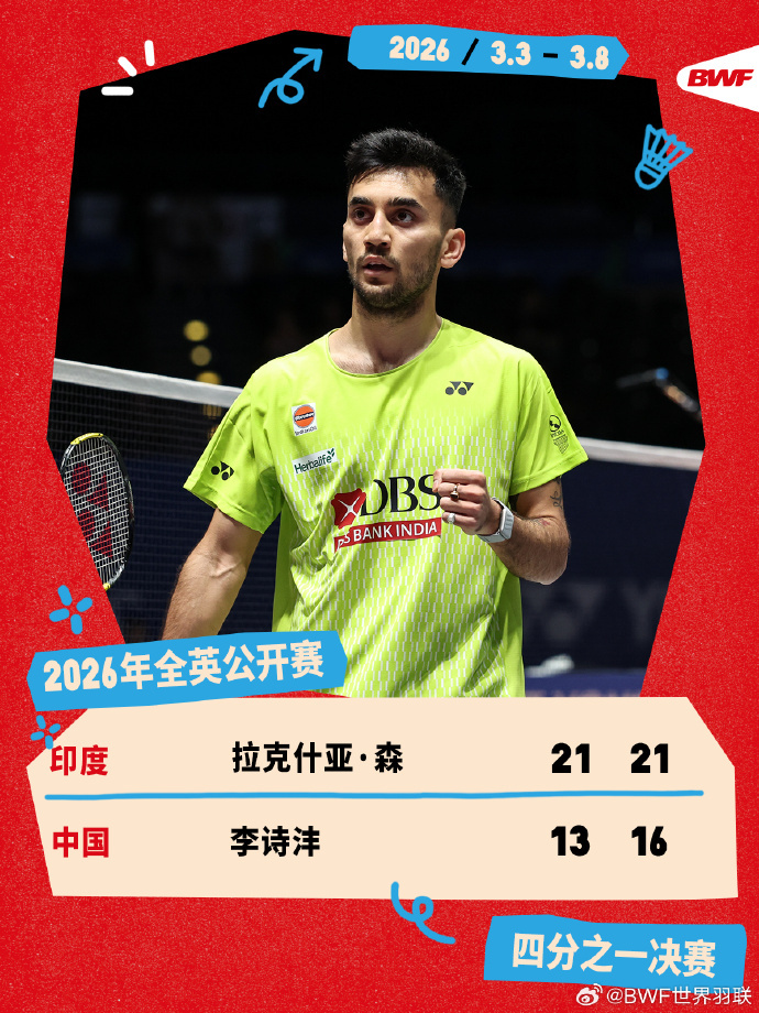 2026全英羽毛球公开赛男单,李诗沣13-31、16-21不敌拉克什亚,无缘晋级半决赛。