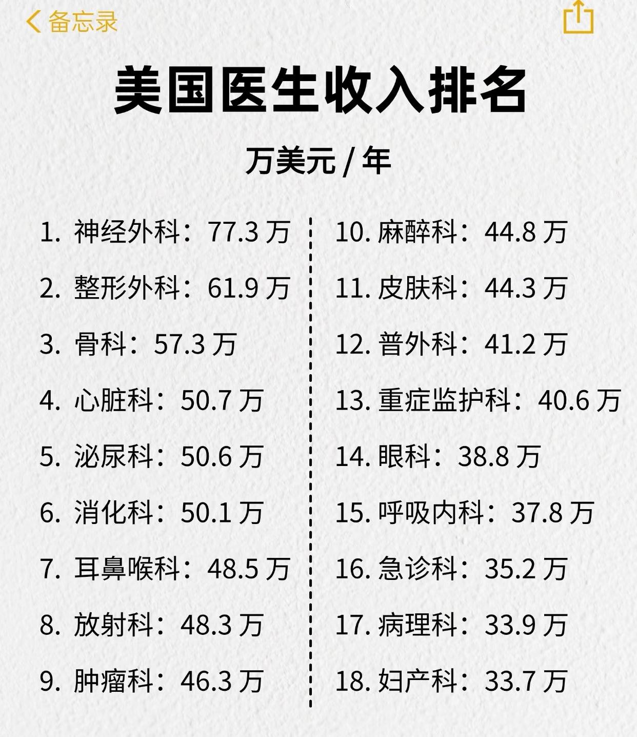 美国医生的收入排名!没想到在美国整形医生收入这么靠前。