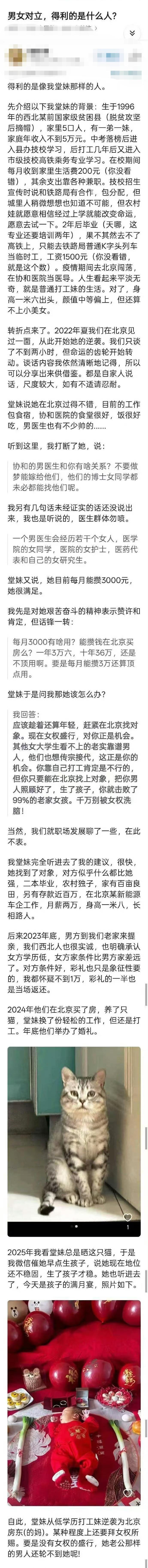 夜之哀伤 3 2026-03-07 10:26 聪明人得利了。搞女权的本质就是一帮坏的骗一群蠢的。本来在婚姻市场,女生的核心竞争力通常是外貌,年龄,身材,职业,人品。一般是没有“大脑算力”这一项的。某种程度上来说“有点笨笨的”反而可能会是加分项。而“搞女权或者男女对立”就是一帮缺少核心竞争力的女人硬是把一群大脑算力低(尽管核心竞争力高)的女人忽悠出了婚恋市场,那这个市场里面一部份的高级资源(有钱或有颜的男人)竞争烈度就降低了。所以最终结果就是大脑算力高的人能获得更高的额外收益。也就是聪明人得利。
