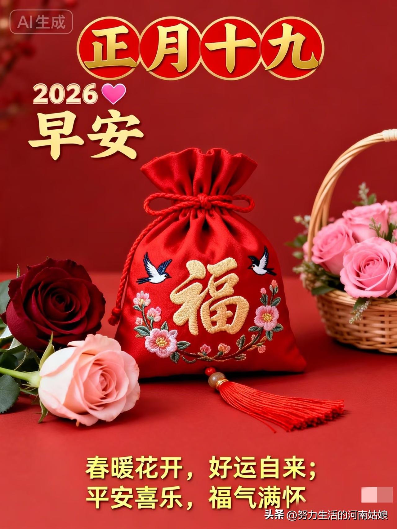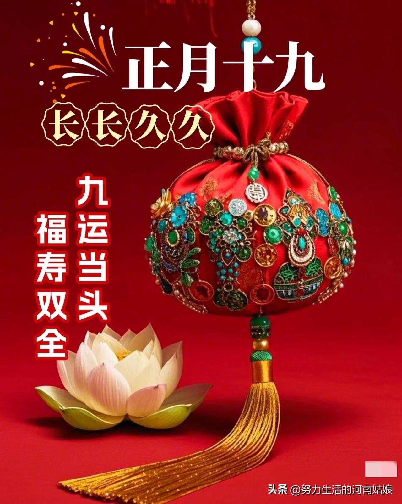 正月十九,周六早安!愿好运常伴,烦恼全走,平安喜乐,万事顺心。[玫瑰] 正月十九,喜逢周六,清晨送福,愿你一天舒心,一周顺遂,平安健康,笑意常在。[福] 正月十九,早安周六!愿日子清欢不扰,所求皆如愿,所行皆坦途。[锦鲤到来] 新的一天,新的开始,正月十九,周六吉祥!愿你心情明媚,生活温暖,事事如意。[招财进宝] 正月十九,早安!愿春风拂去疲惫,阳光照亮心房,周六轻松又愉快。[万柿如意] 正月十九 周六