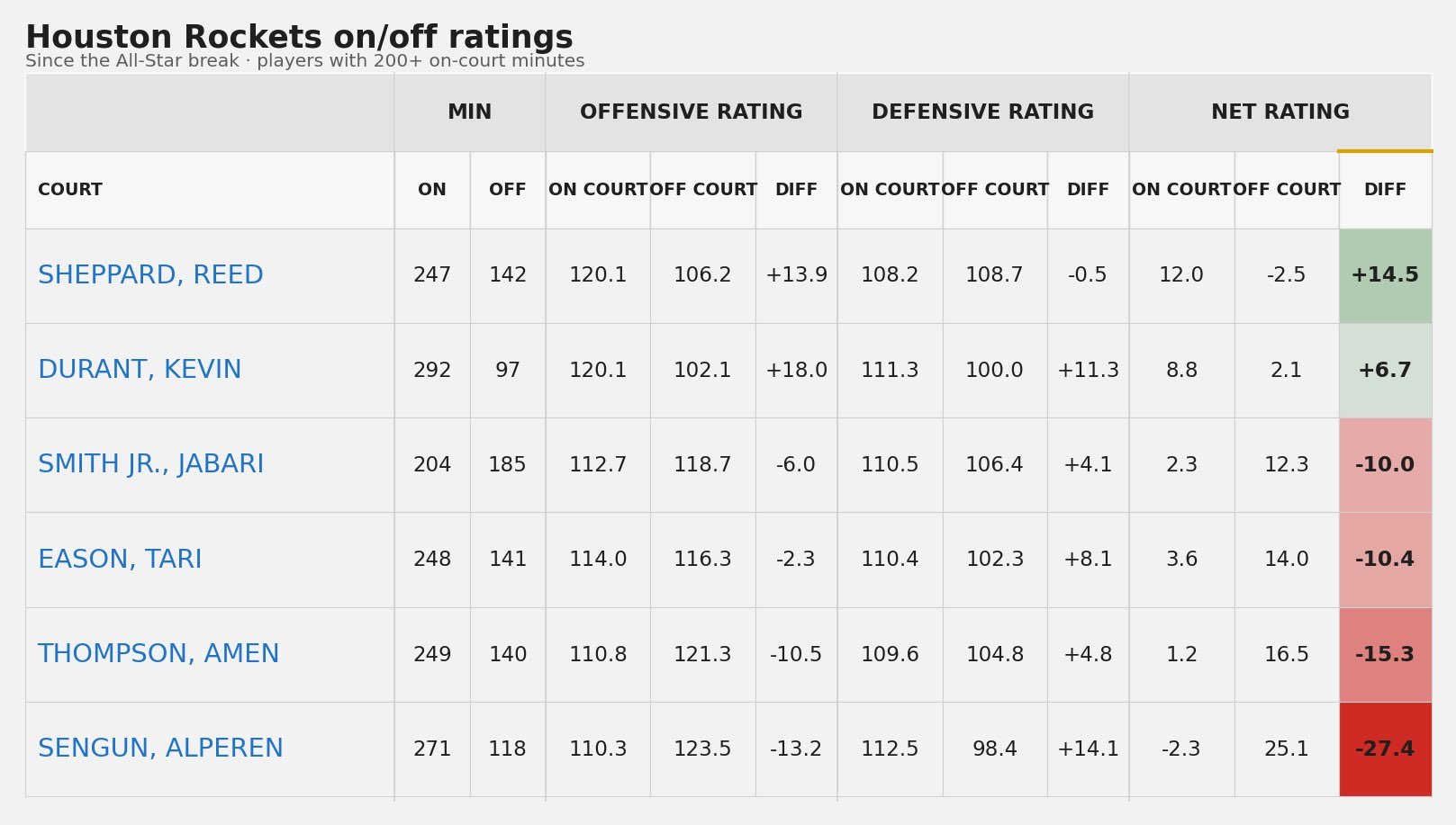 全明星赛后 球员在场/不在场净效率差值(至少上场200分钟)