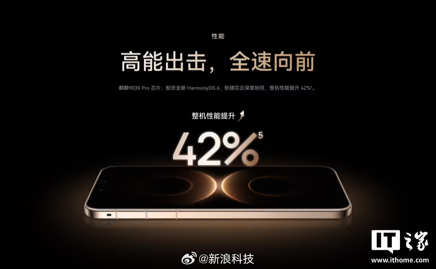 官网信息显示,华为 Mate 80 Pro Max 手机搭载麒麟 9030 Pro 处理器,整机性能对比 HarmonyOS 4.3 出厂版本的 Mate 70 Pro+ 最高提升 42%。