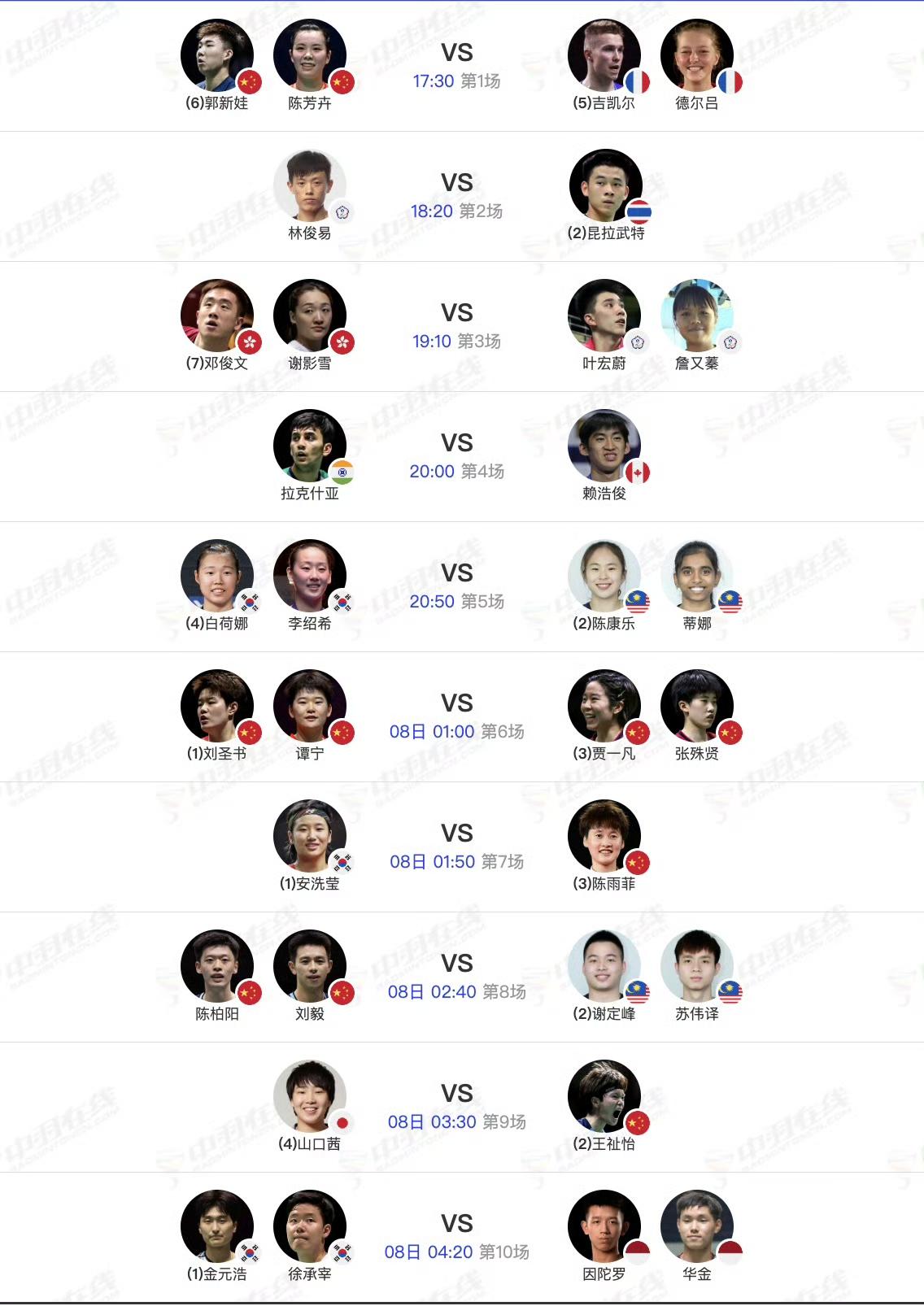 今天开打半决赛! 2026全英羽毛球公开赛今天(3月7日,周六)各单项均进行半决赛,赛程如图所示。 上半场从晚上五点半开战,下半场从明日凌晨一点开战,然而我们国羽选手的比赛大部分集中在了下半场[捂脸]。 国羽男单选手全军覆没,梁王组合今晨止步八强,所幸陈柏阳/刘毅🇨🇳 撑了下来。 陈雨菲🇨🇳、王祉怡🇨🇳今天都是硬仗,期待两人获胜晋级!