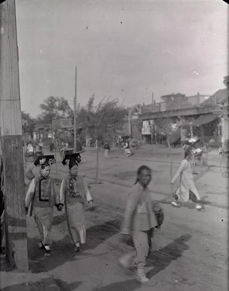 这张照片定格了1908年左右,北京崇文门外的一个日常瞬间,它不仅是一张街拍,更是一幅生动的晚清社会风情画。 画面左侧,两位手牵手的满族妇女是绝对的主角。她们头戴旗头,身着宽大的旗装,脚踩花盆底鞋,手牵手的姿态则显得亲密而自然。一位梳着长辫的男子正快步走过,他的穿着朴素,是当时普通男性市民的打扮,还有其他行人和人力车,共同构成了一幅繁忙的街景。