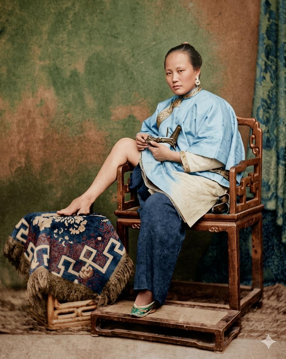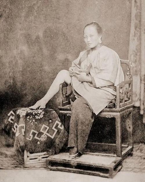 这张照片是一张拍摄于晚清同治年间的珍贵影像,它以一种极具冲击力的方式,记录了中国历史上最残酷的陋习之一——缠足。 照片中的女子端坐在一把中式木椅上,她刻意将一只脚抬起,放在旁边的脚凳上,脱下了鞋子,露出了因长期缠裹而严重变形的“三寸金莲”。她的另一只脚则穿着小巧的弓鞋,踩在脚踏上。她的衣着朴素而整洁,显示出她可能来自一个小康之家。在那个“男女授受不亲”、女子身体被严格禁锢的时代,主动向镜头展示自己的脚,是一件极其大胆甚至“离经叛道”的行为。 这张照片很可能是由在华的外国摄影师拍摄的。在当时,西方世界对中国充满了猎奇心理,而缠足作为一种极端的、在他们看来“野蛮”的习俗,成为了最能满足其好奇心的题材。这类照片大多是摆拍的。摄影师往往需要支付一定的报酬(有时是几块银元),才能说服一位女子脱下鞋袜,供其拍摄。