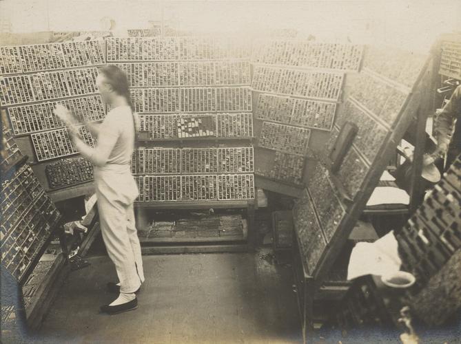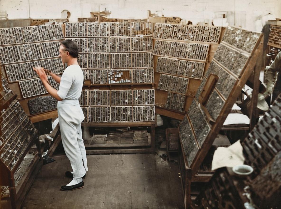 这张照片拍摄于晚清至民国初年的上海,记录了当时一家印刷厂里,排字工人的工作场景。 画面中央的工人,正站在一个巨大的弧形排字架前,双手在密密麻麻的铅字格里飞快地取字。他动作熟练,显示出这是一位经验丰富的“排字先生”。在当时,排字工需要认识大量汉字,才能从成千上万的铅字中快速找到所需的字,因此这份工作被视为一种技术含量很高的脑力劳动。 环绕工人的巨大架子就是排字架,也叫“字架”。它由无数个小方格组成,每个格子里都存放着一枚枚铅活字。这些铅字按照部首、笔画或音韵规律排列,方便工人查找。