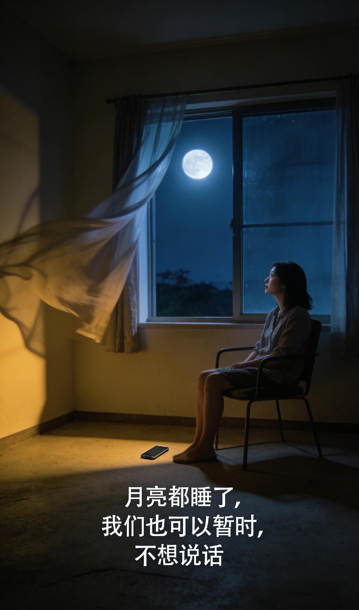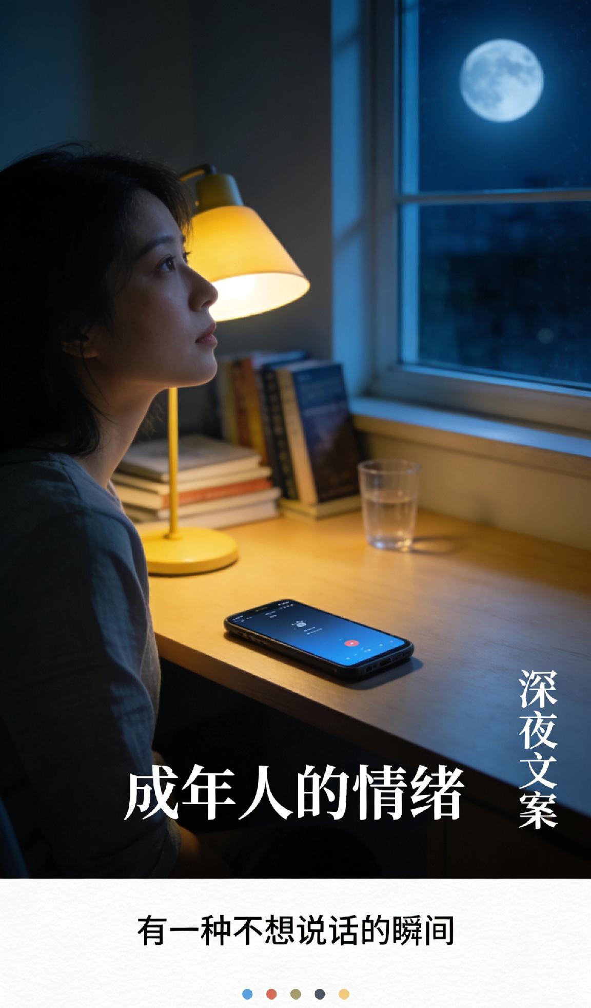 你有没有一瞬间,突然就不想说话了? 不是生气,也不是难过。就是突然把所有声音都关掉了——手机调成静音,消息不回,甚至连划屏幕的力气都没有。 就那么坐着,看着窗外的夜色发呆。 其实也不累。就是心里空落落的,像一间搬空了家具的房子,风可以自由地穿来穿去。 那种空,不是孤独,也不是寂寞。 是突然觉得,说什么都多余。热闹是别人的,喧嚣是世界的,而我,只想做一片夜色里的影子。 懂的人,自然懂。 这种感觉来的时候,连自己都说不清为什么。也许是因为白天的热闹透支了,也许只是因为,月亮太安静了。 如果你也恰好有这样的时刻—— 别慌。就让灵魂暂时停一停。 有些心情,只适合自己消化。有些夜,只适合沉默以对。 月亮都睡了,我们也可以暂时,不想说话。 成年人的情绪 深夜文案