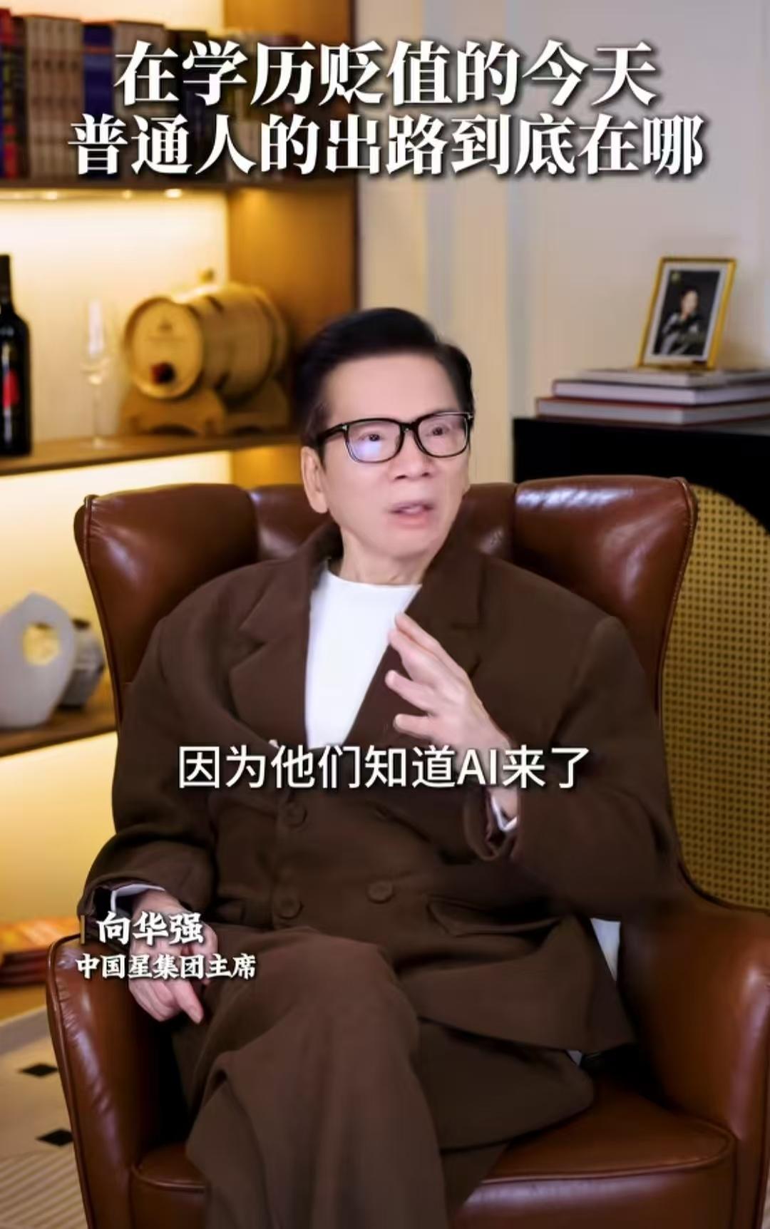 现在好的大学学历还有点用,但是将来肯定没有什么用。普通人该怎么办?向华强是这样说。 他通过教授了解,麻省理工毕业的,以前还没毕业就公司预约,现在有一半都没找到工作。因为Ai来了,大公司尽量不招人了。像律师,以前都需要一伙人去干,去查阅资料案例,但现在低一等的工作ai就可以了,小律师,小会计师没用了。很快,会计师,医生都会一样。 所以,读高中考大学,选择什么专业呢?已经变得没有目标了。读大学还有没有用?他说,大学是培养一个人的心智,学习能力。高中毕业就出来,人很难成熟。 普通人,就学习技能,多留现金伴身吧。未来大概更加需要现金。