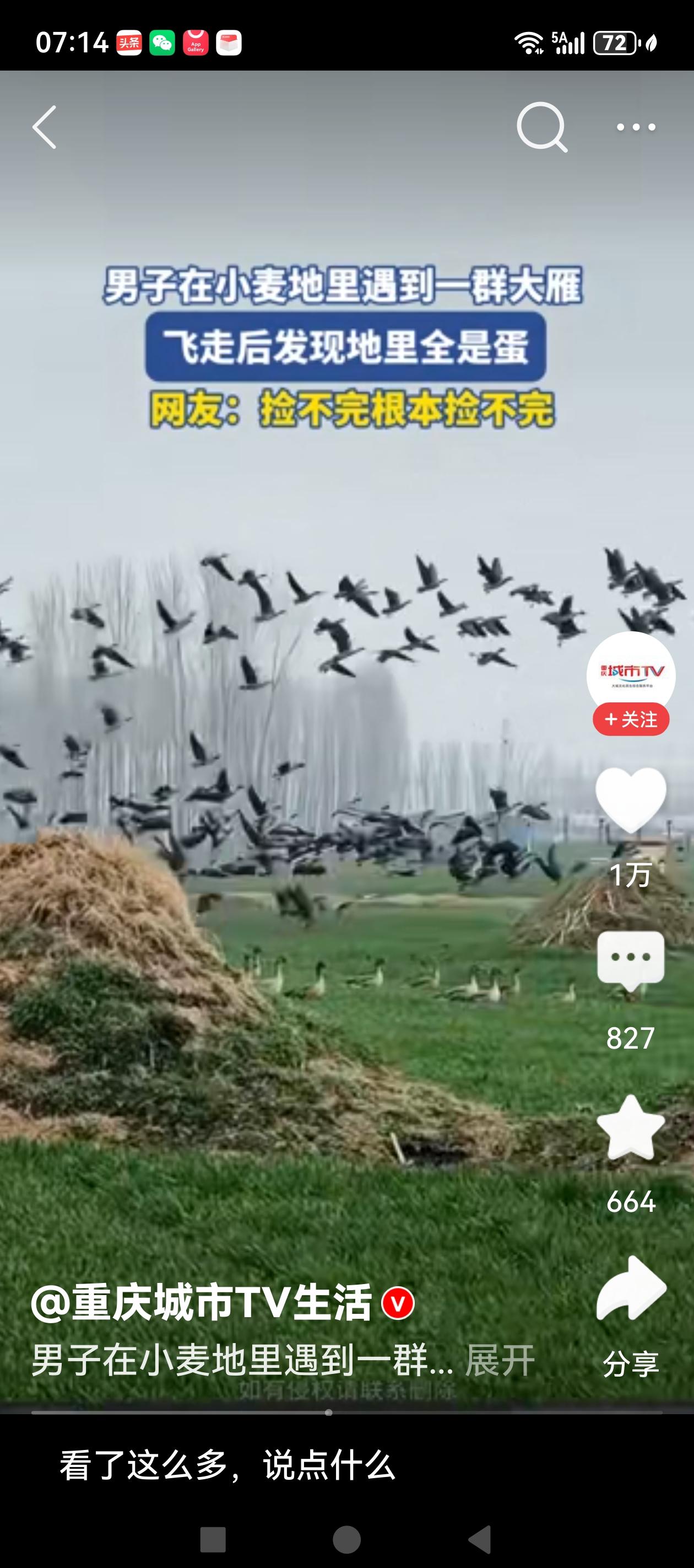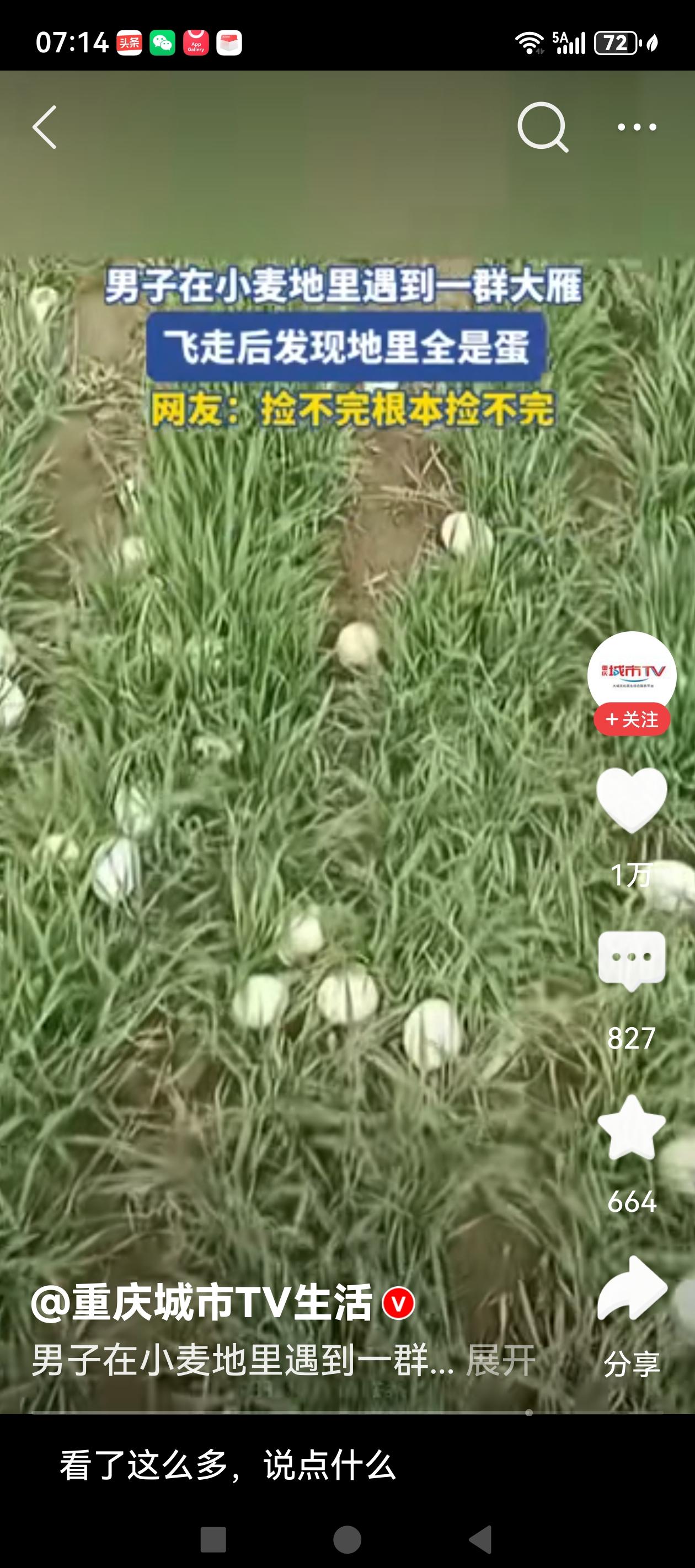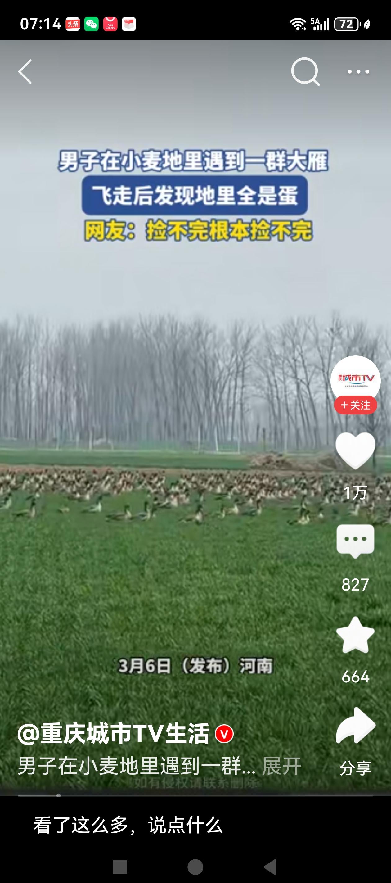 大千世界,总有一份惊喜会属于你! 3月6日,河南一网友发布视频称,路过一片麦田,偶遇落满麦田的大雁。或许是被人惊扰,雁阵起飞,留下了满地的大雁蛋,这算不算一个惊喜。有网友惊叹:捡不完根本就捡不完! 自然界就是这么神奇,惊喜来的有时都让你猝不及防。但惊喜之余,问题也来了,这满地的大雁蛋能随便捡吗?当然不能,还是给大家普及一下野生动物保护常识吧。 野生大雁属于国家二级保护动物,受到法律的严格保护。野生大雁在野外产的蛋绝对不能随便乱捡,否则可能会承担法律风险。 根据《野生动物保护法》,野生动物的蛋属于野生动物制品范畴,捡拾国家保护动物的蛋涉嫌非法猎捕珍贵、濒危野生动物罪,轻者面临行政处罚,重则处5年以下有期徒刑并处罚金。这后果是不是很严重,遇到这种情况怎么办呢,最稳妥的做法就是联系当地林业部门或野生动物保护机构,千万不能私自处理。 男子麦田遇雁群 走近地上全是蛋