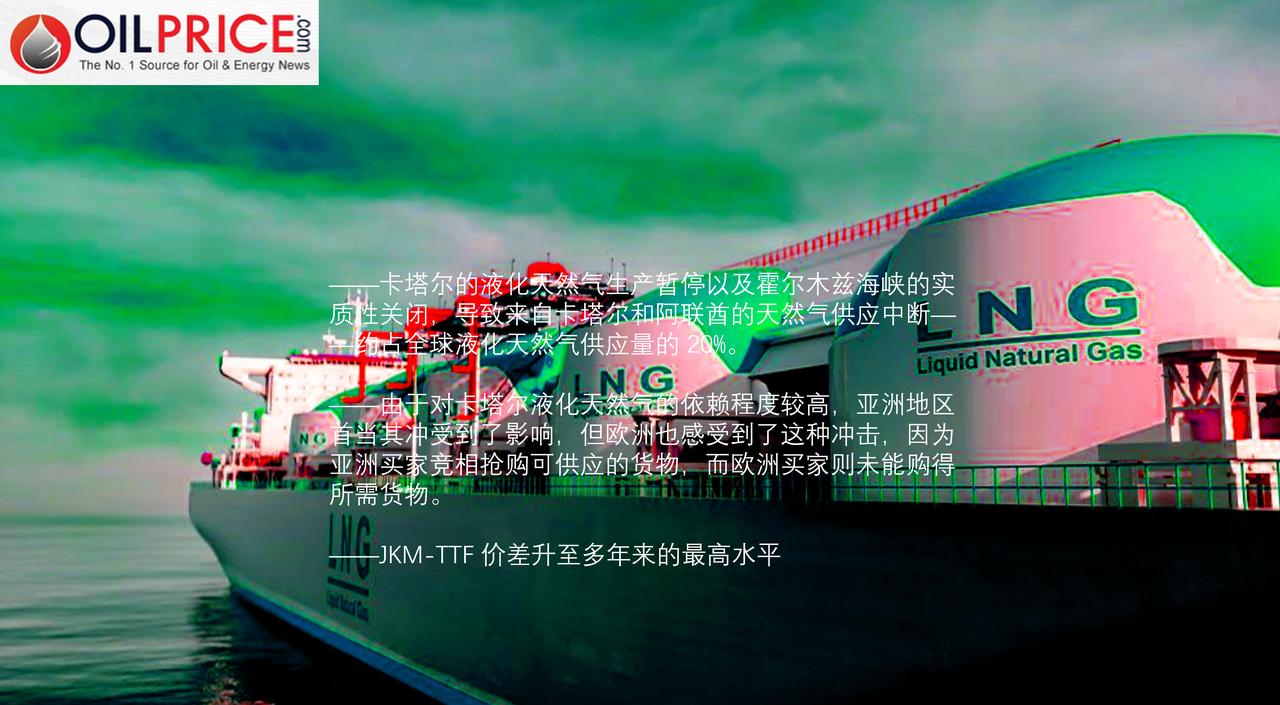 伊朗战争扰乱了液化天然气市场并推高了天然气价格 就在一个月前,欧洲还吸引了大部分液化天然气现货货物的运输业务。由于欧洲对天然气的需求强劲,且其天然气库存迅速减少,其价格高于亚洲。而亚洲的天然气需求则较为低迷。 在当今的国际政治格局中,一个月的时间已经很长了。本周,全球天然气市场遭受了巨大的冲击,导致供需趋势发生根本性的改变。 卡塔尔停止液化天然气的生产以及霍尔木兹海峡的实际上的关闭,给亚洲和欧洲的天然气市场带来了冲击,让人想起了 2022 年的那场危机。 尽管亚洲接收了卡塔尔大部分的液化天然气,但欧洲也正像亚洲一样深受霍尔木兹海峡危机的影响,因为全球市场趋紧,亚洲的液化天然气价格相对于欧洲的价格大幅上涨,从而将现有的现货供应重新分配给了亚洲的进口商。 能源市场分析公司 Vortexa 的航运风险与情报部门主管克莱尔·詹曼本周早些时候在接受路透社采访时表示:“液化天然气市场没有剩余产能,因此这种供应中断可能会迅速且严重地发生。” 来自卡塔尔和阿联酋(两国合计约占全球液化天然气供应量的 20%)的液化天然气运输业务现已停止,原因是卡塔尔能源公司宣布其拉斯拉凡枢纽的液化天然气生产暂停,并且没有船只通过该海峡。 由于霍尔木兹海峡的交通已完全中断,对亚洲的液化天然气供应冲击随即显现,而欧洲则感受到了全球 20%的液化天然气供应中断所带来的次生影响。 因此,亚洲的现货液化天然气价格以及欧洲的 TTF 基准天然气价格近日均大幅上涨,达到了多年来的最高水平。 Vortexa公司的副液化天然气市场一分析师表示,卡塔尔的液化天然气出口总量中,有 85% 被输送到亚洲,因此短期内的物理供应短缺情况主要集中在亚洲地区。 “中国、印度以及台湾地区属于受此风险影响最为严重的进口目的” 该分析师补充道。 欧洲通常从卡塔尔进口的液化天然气约占总量的 12%——这一比例远低于亚洲所占的比例。 然而,亚洲供应紧张所带来的影响对欧洲来说也相当严重,因为目前欧洲在替代现货供应方面已落后于亚洲,而亚洲产品的价格相对于欧洲产品价格的溢价大幅上升,套利交易为自 2022 年底以来向亚洲发送液化天然气货物提供了最强的信号,这使得欧洲失去了与亚洲竞争的机会。 JKM-TTF 价差(衡量亚洲现货液化天然气价格相对于欧洲天然气基准价格的溢价)在周二飙升至逾 6 美元/百万英热单位的多年高位。 液化天然气运费也在大幅上涨,在斯帕克商品评估机构的统计中,周二的涨幅创下了有史以来的最大单日涨幅。根据斯帕克商品的数据,亚洲的套利信号目前达到了自 2022 年 12 月以来的最强水平。 此外,一些地区的供应中断情况也正在加剧全球天然气市场的紧张局势,比如以色列关闭了海上天然气田以及对埃及的天然气出口,这使得亚洲和欧洲在获取任何可用的现货液化天然气供应方面面临更大的压力。 未来几周,亚欧之间的竞争将会愈发激烈。而且由于美国在中东战争爆发前就已经将液化天然气出口量提升到了极限水平,所以在霍尔木兹海峡重新对油轮开放通行之前,没有任何一个供应源能够弥补全球供应量减少 20%所带来的损失。 能源商品分析机构Kpler的阿梅纳·巴克在本周早些时候的一份报告中写道:“美国的液化天然气出口基础设施已经接近满负荷运转,这限制了美国出口商填补这一缺口的能力。” 伍德麦肯兹公司天然气与液化天然气研究部门副总裁马西莫·迪奥多拉本周早些时候表示:“液化天然气运输线路的中断将重新引发亚洲和欧洲之间对可用货物的竞争,尤其是在欧洲储气库水平低于季节性正常水平且比去年同期低约 10%的情况下。此前在 1 月份曾遭遇了一次严重的寒潮。” 据伍德麦肯兹公司的估计,如果霍尔木兹海峡的石油运输停运一周,那么由此导致的液化天然气出口量就会减少约 1500 万吨(即 22 亿立方米)。 迪奥多阿雷指出:“鉴于全球液化天然气供应已经遭受了巨大冲击,‘亚洲和欧洲市场都需要更多地利用现有的储存设施,并且在夏季期间会增加补货的需求。’” “这将使市场形势进一步恶化,远超出通过海峡恢复贸易所能带来的改善程度。”